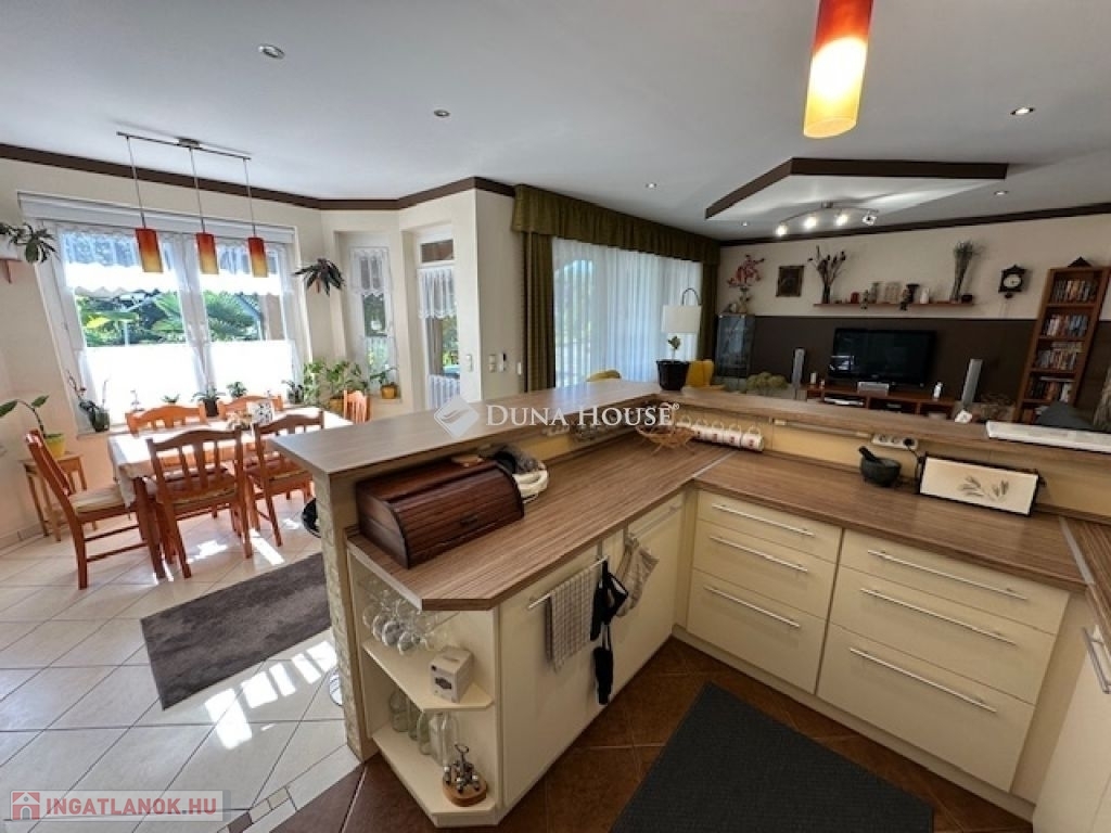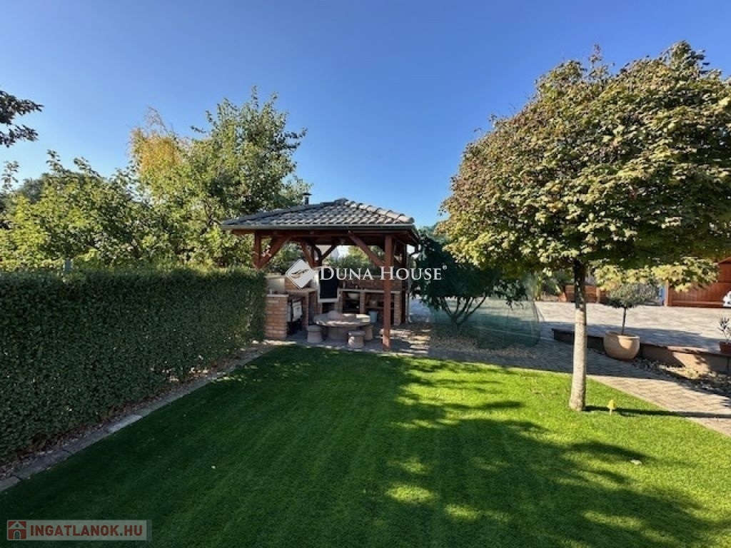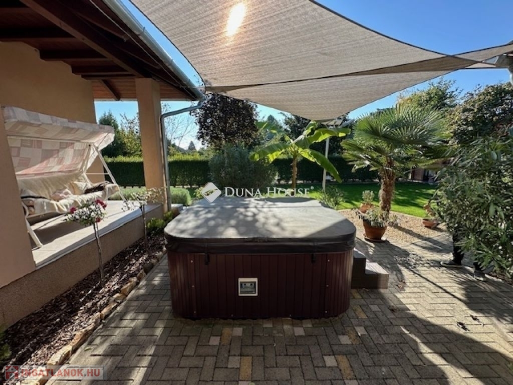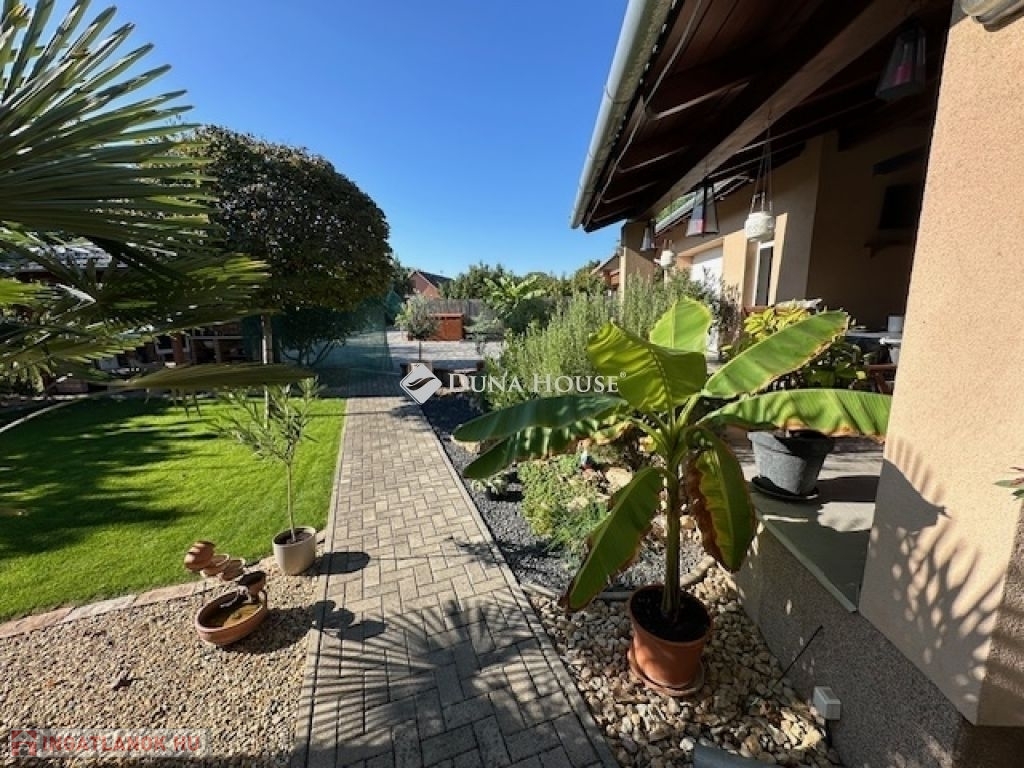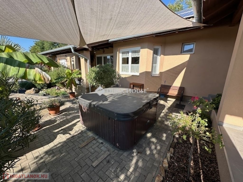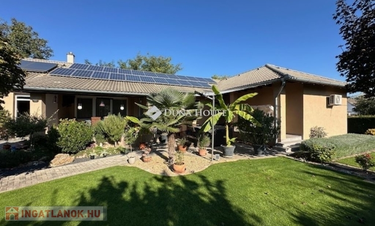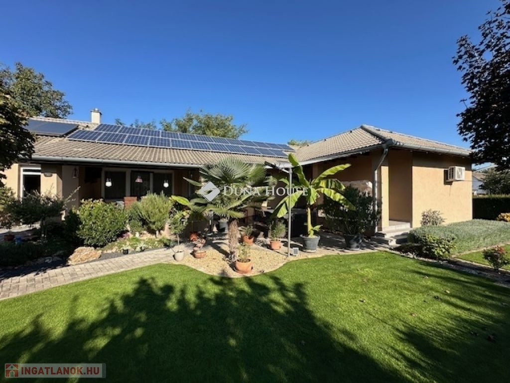 Eladó Nagyvenyimen egy 146 m2-es, 2009-ben épült, téglaépítésű családi ház. 3 szobával és egy tágas, amerikai konyhás nappalival rendelkezik. Ez az otthon, világos és barátságos hangulatú. Az épület szerkezetileg masszív, gondosan karbantartott, modern igényeknek megfelelően kialakított. Az ingatlan kiemelkedik tervezésének és elosztásának köszönhetően is, ahol minden helyiség ideális méretű és könnyen bútorozható, hogy otthonosan érezze magát a szobákban és a tágas nappaliban egyaránt. A házban padlófűtés, klíma és vegyes tüzelésű kazán biztosítja a meleget, valamint 7 kW-os napelemrendszer gondoskodik a gazdaságos üzemeltetésről. Az épület 10 cm vastag hőszigeteléssel ellátott - a födém is - így energia hatékonysága kiemelkedő. A garázsban szauna kapott helyet, valamint a kamerás automata kapu kényelmes bejutást biztosít. A füvesített, automata öntözőrendszerrel ellátott, gondosan karbantartott, gyönyörű kert igazi pihenőoázis, ahol jakuzzi és bográcsozó, valamint dísz és egzotikus növényekkel beültetett környezet teszi teljessé a harmóniát. Ez tökéletes helyszín családi és baráti kikapcsolódáshoz. Kiváló választás azoknak akik távol a város zajától mégis remek infrastruktúrájú településen keresnek egy modern és igényes otthont.