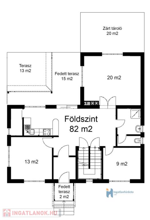 A földszinten található amerikai stílusú konyha, étkező, kamra, 3 szoba, fürdő és külön WC, szélfogó és egy félig fedett terasz. A földszinti lakótér mérete nettó 82m2.