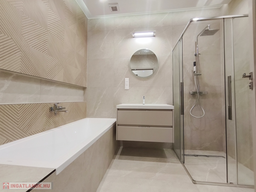 A lakás járólap és laminált padló burkolatokkal, hőszivattyús padlófűtéssel, valamint inverteres hűtő-fűtő klímával felszerelt. A 3 rétegű üvegezésű műanyag nyílászárók elektromos alumínium redőnyökkel rendelkeznek, biztosítva az energiahatékonyságot és a kényelmet.