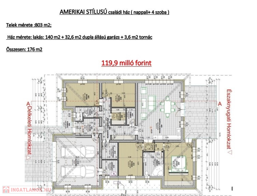 Nyíregyháza, Nyírszőlőben lefoglalható 140 m2-s négy különnyíló szobás, nappali+amerikai konyhás, fürdőszoba+wc, zuhany+wc, kamra, mosókonyha+kazánház, 3 rétegű üveg műanyag nyílászárós, egyedi gáz+ padlófűtésű + 3,5 kw-s hűtő-fűtő klímás, nagy teraszos amerikai típusú családi ház. Az ingatlan porotherm 30-s téglából épül, belső 10-s tégla falak gépi vakolással simítva, külsőleg 15 cm-s nikecel szigetelés rajta nemes vakolat borítás, fafödémes rajta 30 cm-s kőzetgyapot szigetelés, mennyezet fémvázra erősített gipszkarton rajta páraáteresztő fólia, betoncseréppel fedett alatta hővédő fólia. A külön álló családi ház 803 m2-s telken fekszik mely teljesen körbe kerített, utcafrontról szép kerítéssel, 32,6 m2-s garázzsal melynek automata garázskapuja és térkövezett felhajtója lesz. Birtokba adás szerződéstől számítva 10-12 hónap!