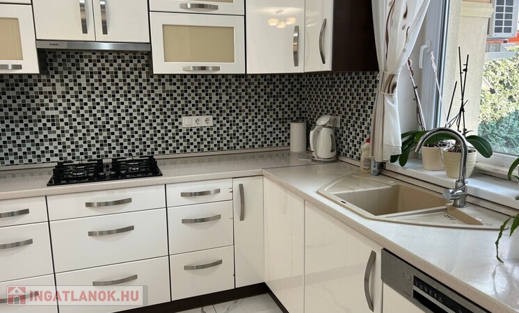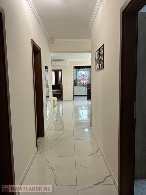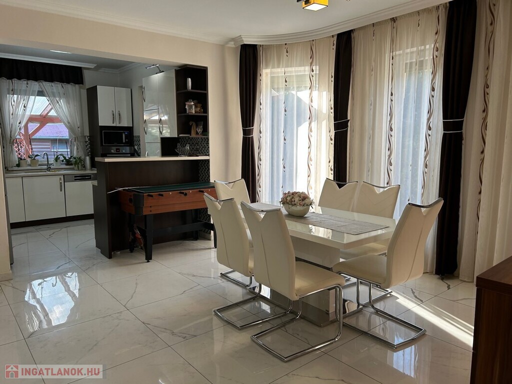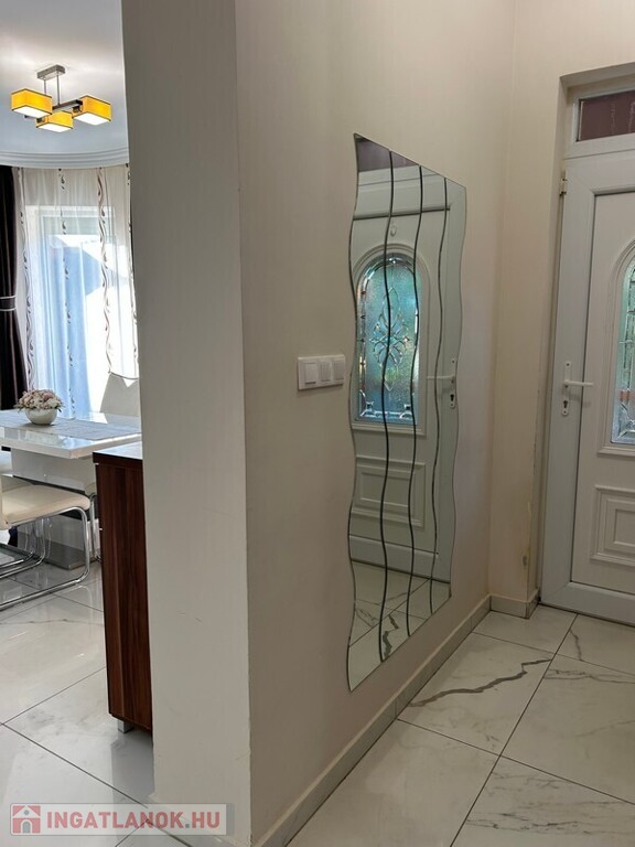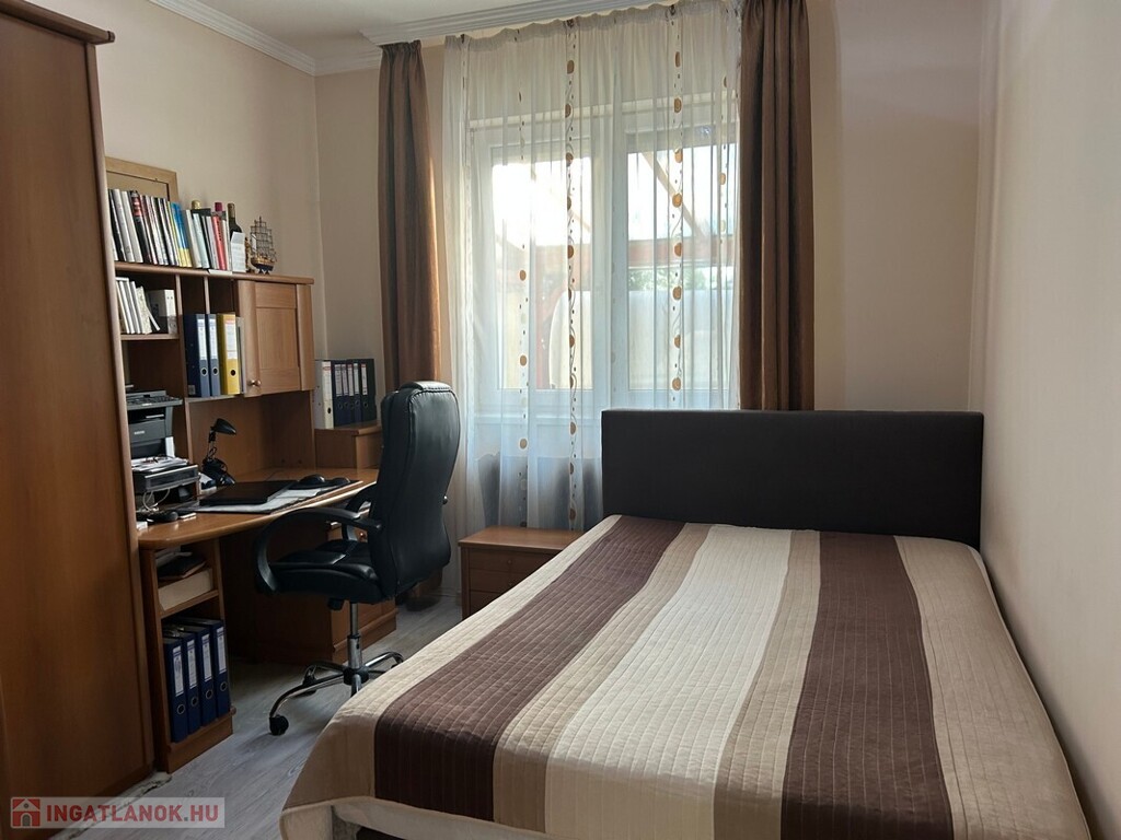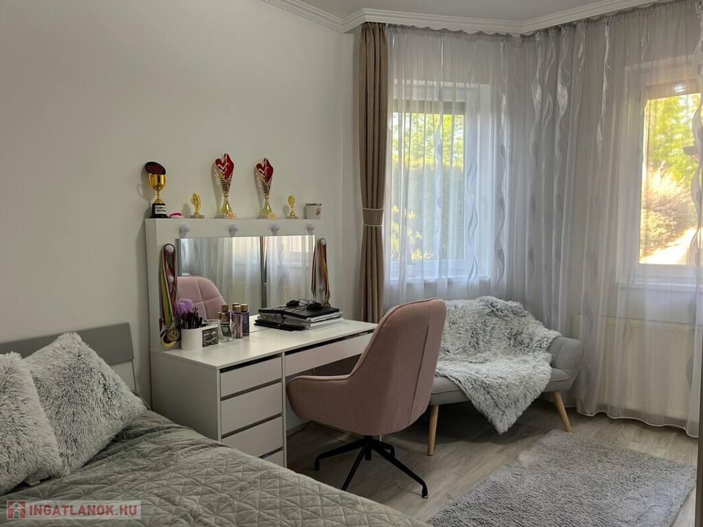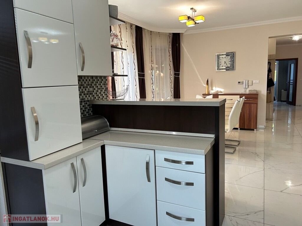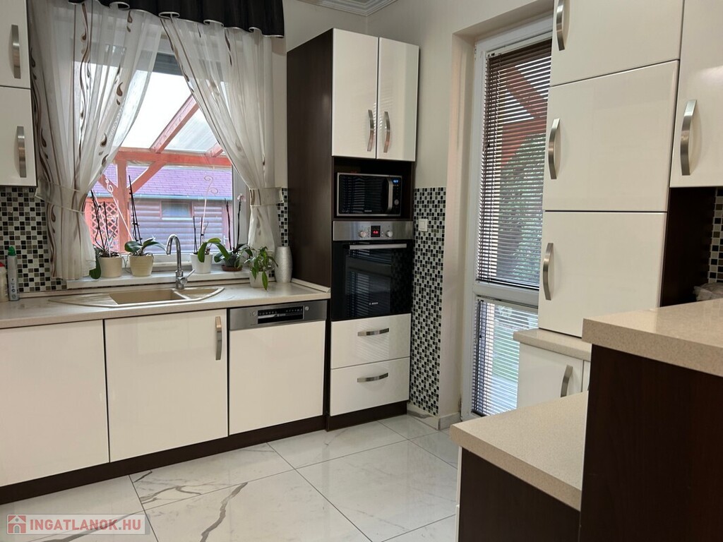 Nyíregyházán a Tesco mögötti kertvárosi részen eladó 100 m2-s három különnyíló szobás, amerikai konyha+nappali+étkező egy térben, mosókonyha, fürdőszoba és wc egyben, fűtése HAJDÚ 24 kw-s kazánról egyedi gáz, padló+radiátor és 4 db. klíma fűtésű melyhez 6,25 kw-s napelem tartozik, műanyag nyílászárós melyek elektromos redőnnyel felszereltek, 30-s téglából épült, külsőleg 10 cm-s szigeteléssel, fafödémes a mennyezet fémvázra erősített gipszkarton rajta 30 cm-s üveggyapot szigetelés a padlás járható, beton cseréppel fedett 2015-ben épült újszerű állapotú iker családi ház egyik oldala. Az ingatlan 450 m2-s gyönyörűen parkosított telken fekszik, kiépített öntöző rendszer van mely fúrott kútról vezérelt, garázs előtt 24 m2-s térkövezett fedett autó beálló, térkövezett járda, kovácsolt vas kerítés, 30 m2-s fedett burkolt terasz, kiépített riasztó és kamera rendszer található. Továbbá az udvarban 20 m2-s filagória mely konyhabútorral felszerelt a kerti tároló külső wc-vel ellátott, automata garázs és kapubejárat, udvarban mozgás érzékelő lámpa. Az ingatlanban marad a beépített gépesített konyhabútor. Költözni megegyezés szerint!