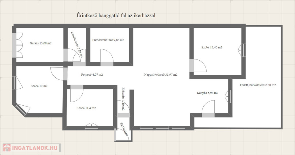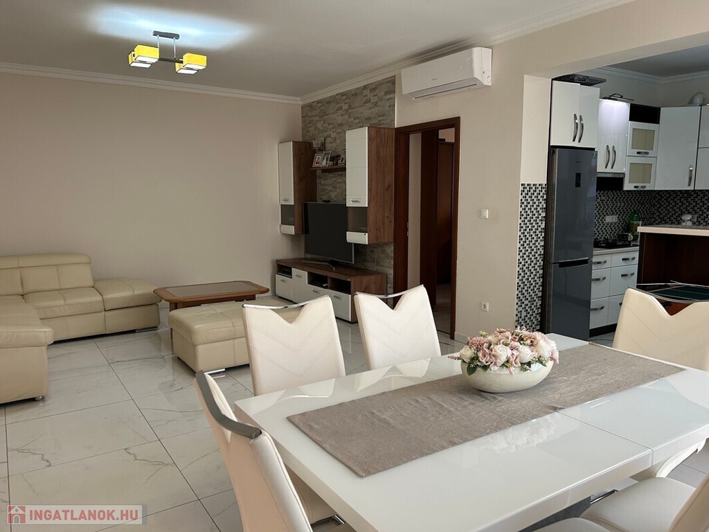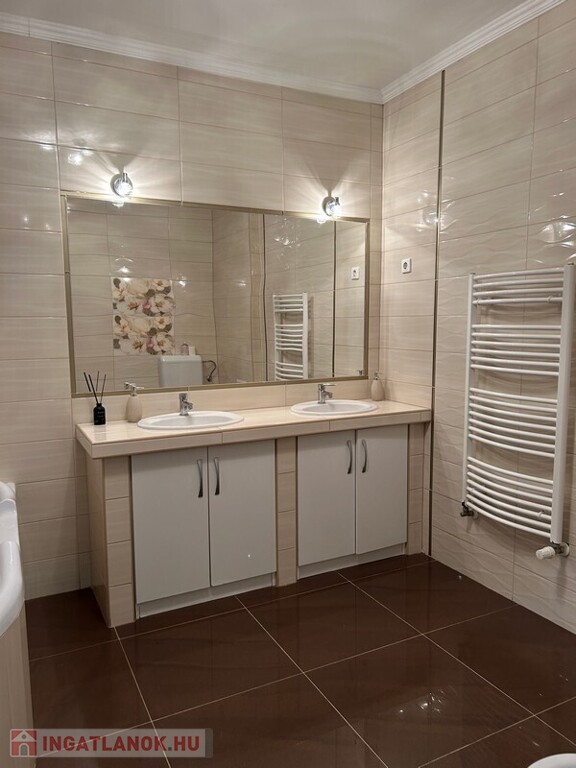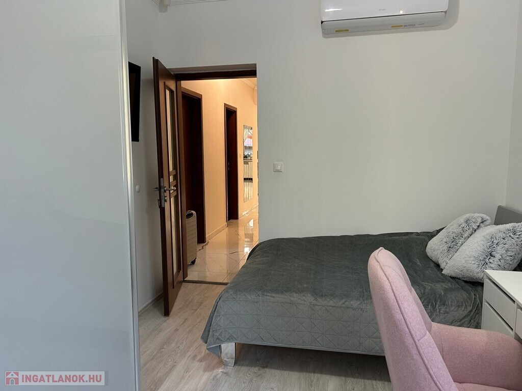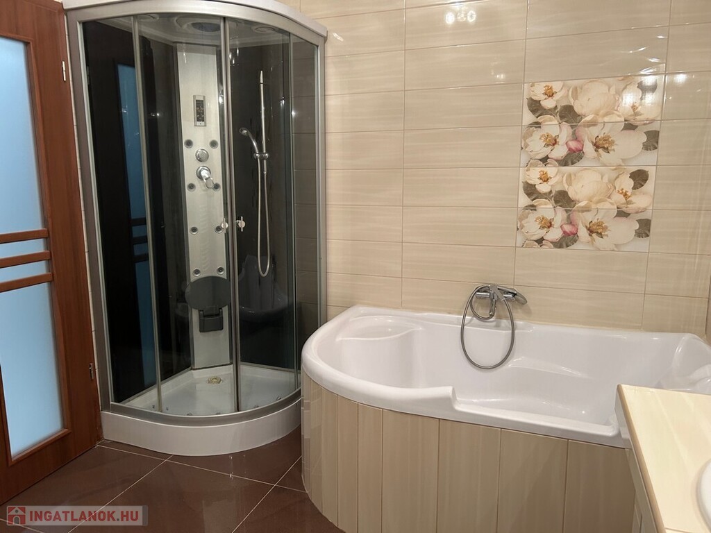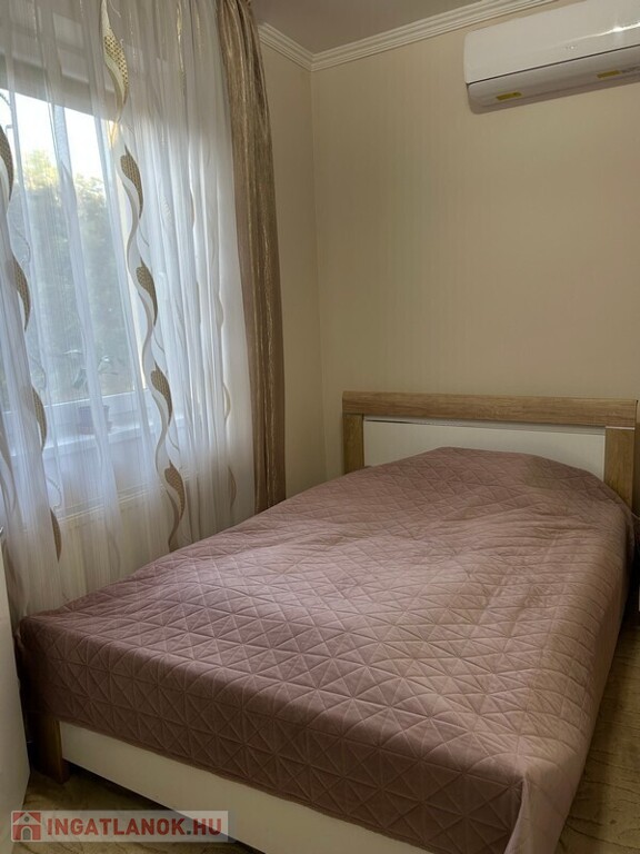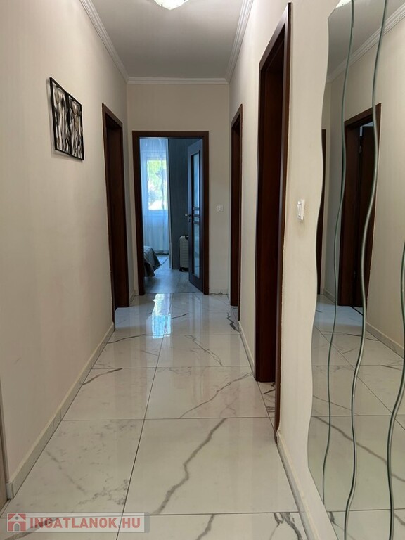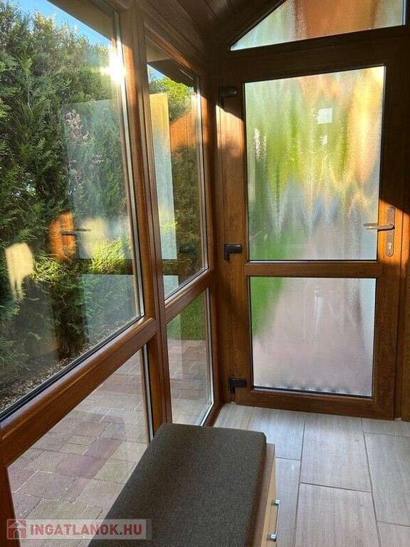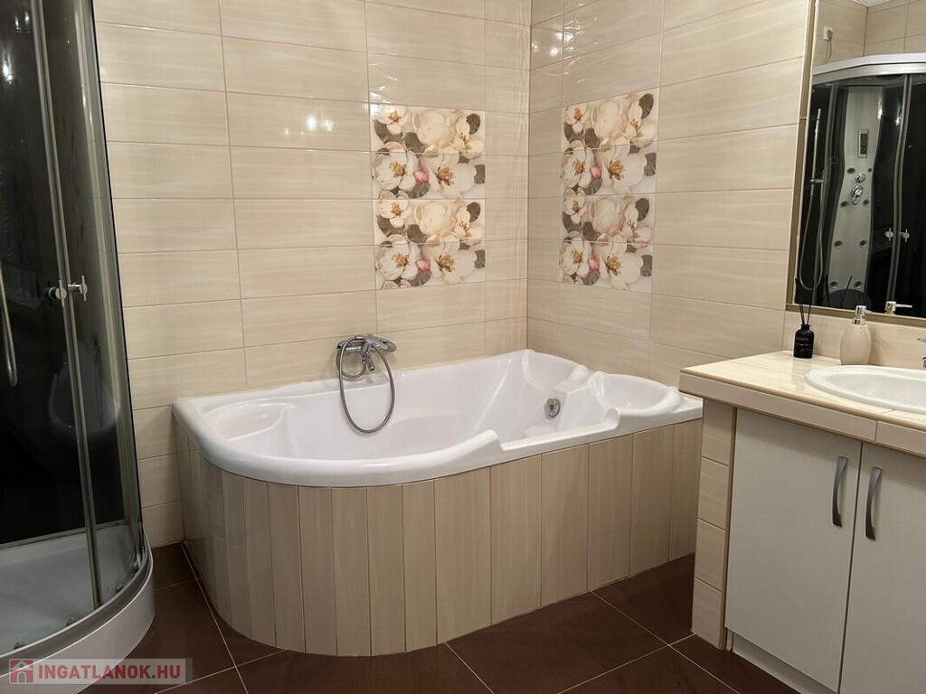 Nyíregyházán a Tesco mögötti kertvárosi részen eladó 100 m2-s három különnyíló szobás, amerikai konyha+nappali+étkező egy térben, mosókonyha, fürdőszoba és wc egyben, fűtése HAJDÚ 24 kw-s kazánról egyedi gáz, padló+radiátor és 4 db. klíma fűtésű melyhez 6,25 kw-s napelem tartozik, műanyag nyílászárós melyek elektromos redőnnyel felszereltek, 30-s téglából épült, külsőleg 10 cm-s szigeteléssel, fafödémes a mennyezet fémvázra erősített gipszkarton rajta 30 cm-s üveggyapot szigetelés a padlás járható, beton cseréppel fedett 2015-ben épült újszerű állapotú iker családi ház egyik oldala. Az ingatlan 450 m2-s gyönyörűen parkosított telken fekszik, kiépített öntöző rendszer van mely fúrott kútról vezérelt, garázs előtt 24 m2-s térkövezett fedett autó beálló, térkövezett járda, kovácsolt vas kerítés, 30 m2-s fedett burkolt terasz, kiépített riasztó és kamera rendszer található. Továbbá az udvarban 20 m2-s filagória mely konyhabútorral felszerelt a kerti tároló külső wc-vel ellátott, automata garázs és kapubejárat, udvarban mozgás érzékelő lámpa. Az ingatlanban marad a beépített gépesített konyhabútor. Költözni megegyezés szerint!
