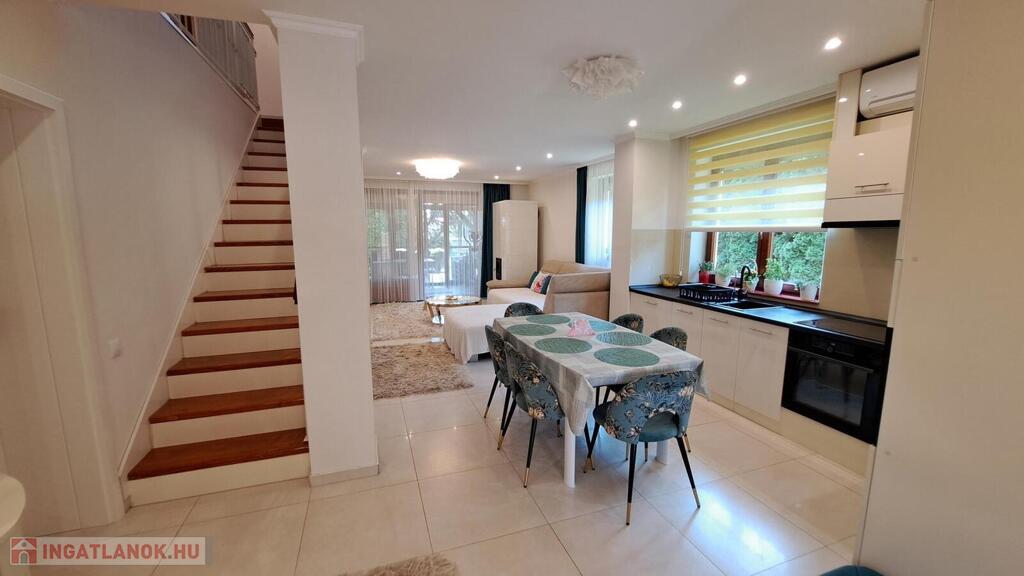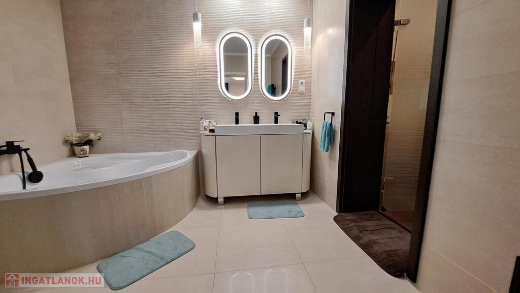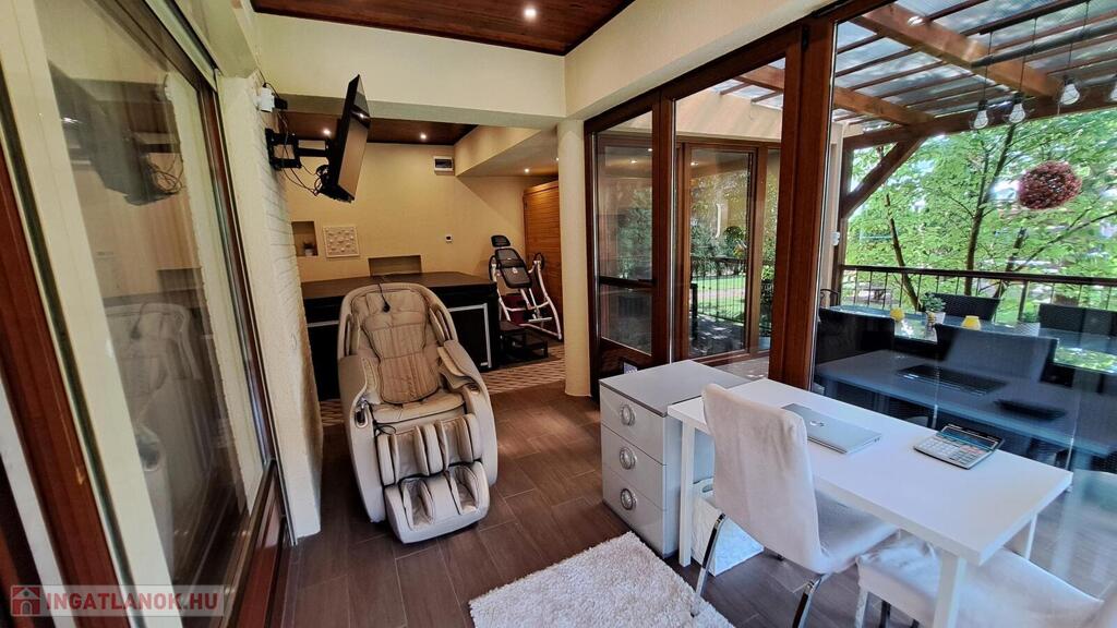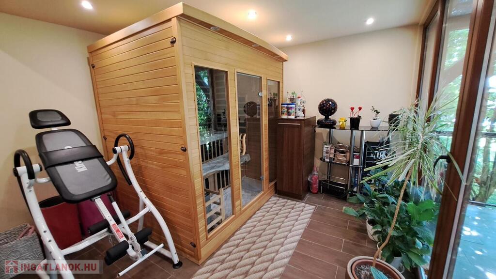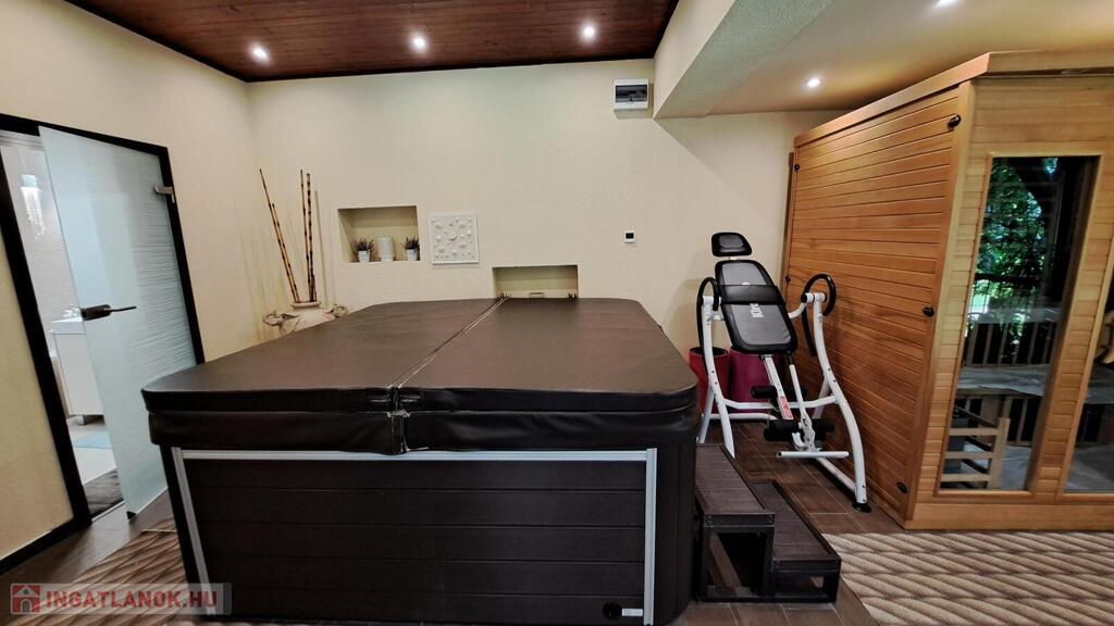 Extrák: Teljes körű wellness részleg (szauna, jakuzzi), elektromos padlófűtéses télikert, riasztó- és kamerarendszer, központi porszívó, elektromos redőny, ipari áram