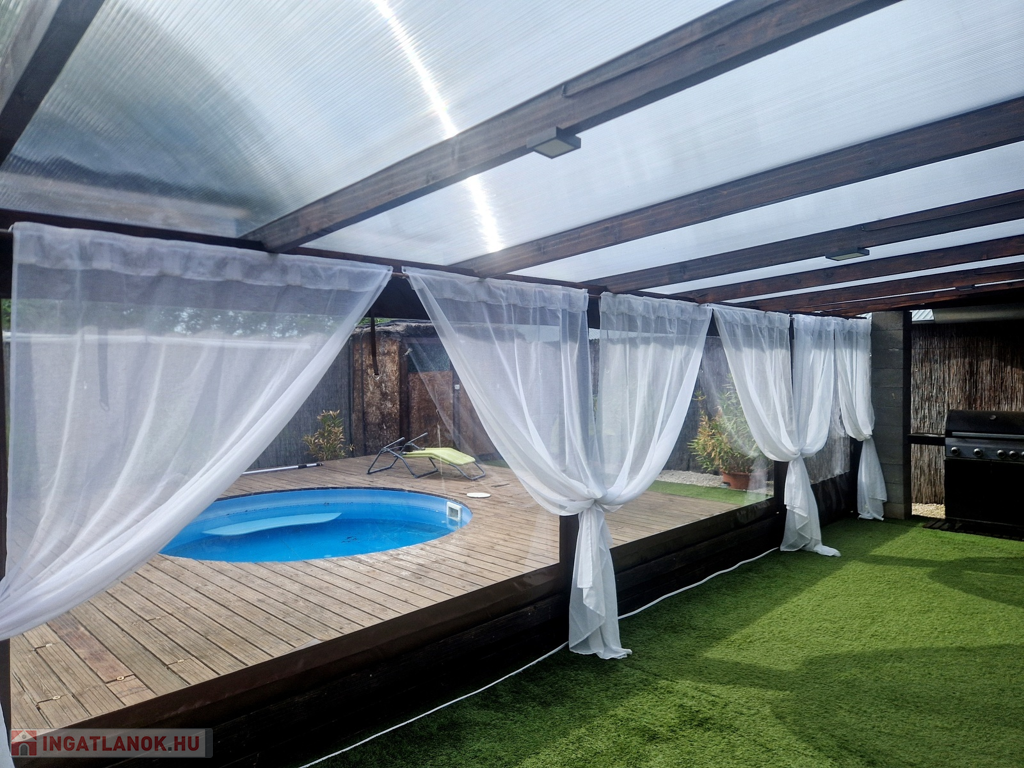 Továbbá az ingatlan területén található 2 különálló, gondozott kert is, ahol hangulatos filagória és medence wellness részleggel biztosítja a pihenést, plusz egy természetes halastó is, ami 20m × 10m-es vízfelülettel várja a kikapcsolódásra vágyókat.