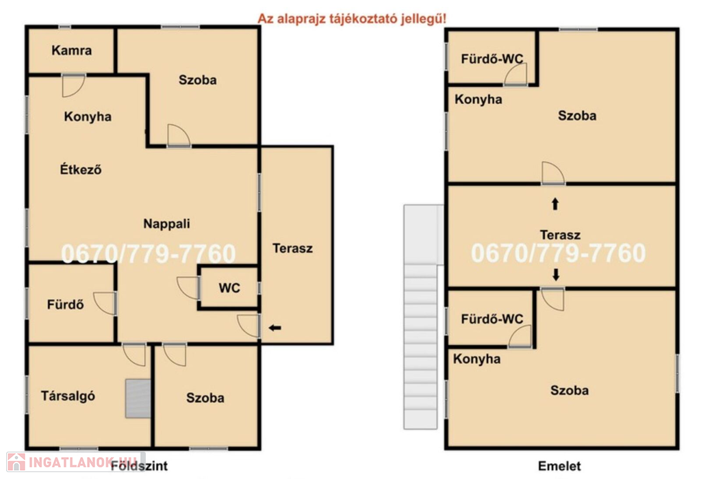 Az ingatlan földszinti része 150 nm-es, 2 szoba, nappali-konyha-étkező, nagy fürdőszoba, külön WC, kamra, és egy társalgó található amelyből megközelíthető az alagsor amelyben akár Wellness rész is kialakítható. A felső szint külön külső feljárattal rendelkezik, ahol 2 db külön bejáratú 36-36 nm-es önálló lakrészek kerültek kialakításra. A lakrészekben 1 tágas szoba, fürdőszoba-WC vel, és egy konyharész található.