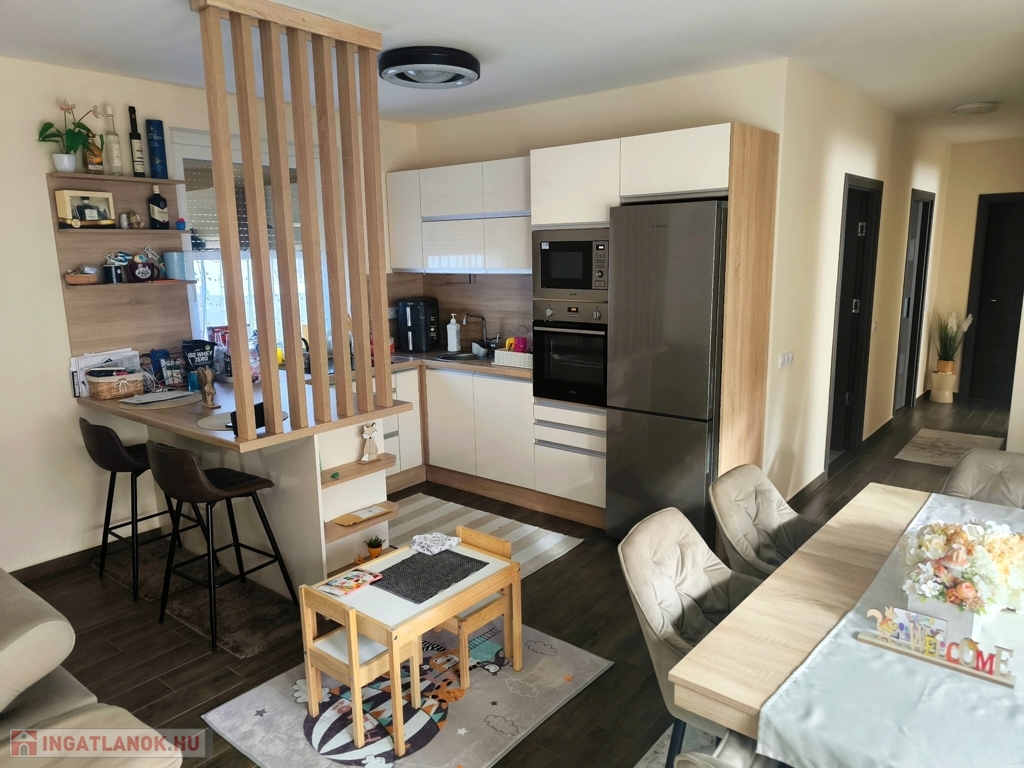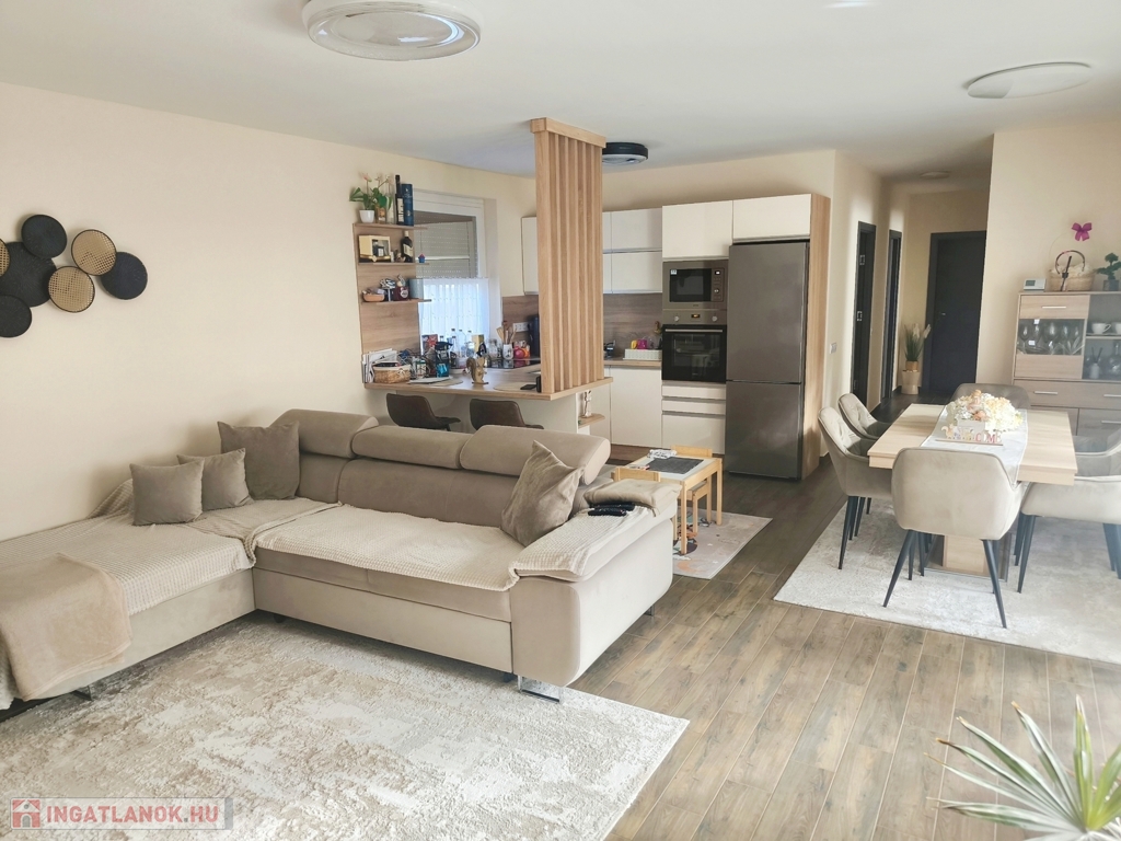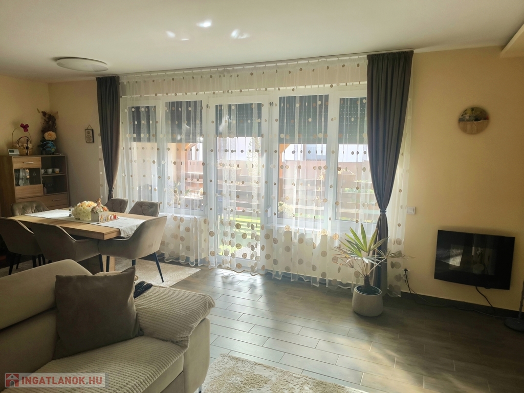 Az ingatlan elrendezése: Nappali-konyha-étkező, 3 külön nyíló szoba, 18 nm-es terasz, fürdőszoba káddal, zuhanyzóval, külön helyiségben wc, mosókonyha, egy állásos garázs.