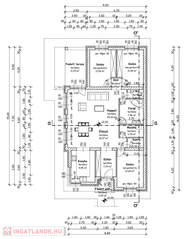 Nappali–konyha–étkező: - fedett teraszkapcsolattal,