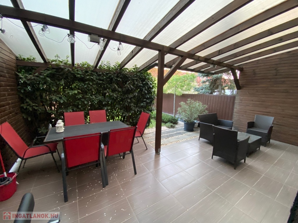 A házhoz tartozik egy 100 m²-es, parkosított, privát pihenőkert melléképülettel, továbbá egy 25 m²-es fedett terasz is, amely ideális kikapcsolódásra.
