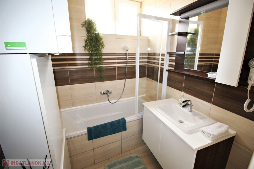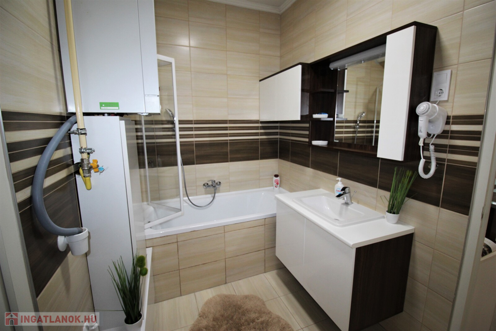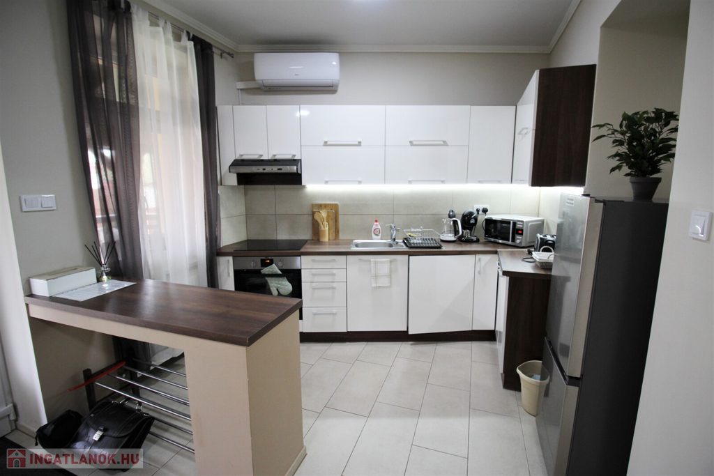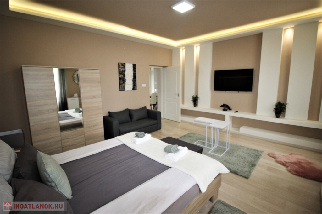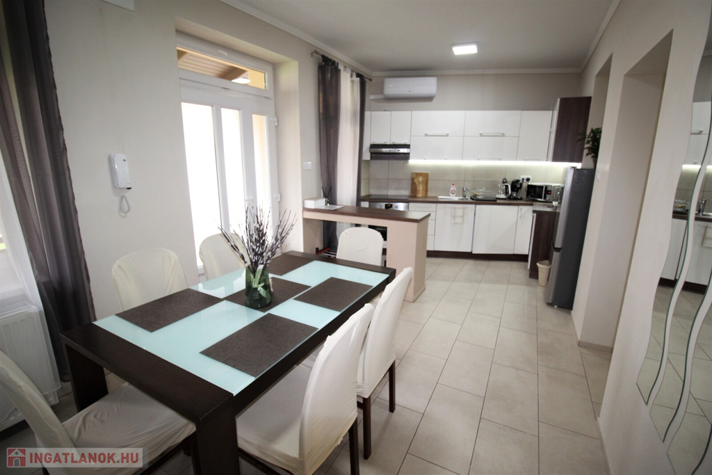 Az ingatlan külsőleg hőszigetelt, klimatizált, műanyag nyílászárókkal, LED fényforrásokkal, egyedileg tervezett beépített-gépesített konyhabútorral felszerelt.Az apartmanház kettő részre van osztva, minden közmű külön van, az első része 75 nm-es, 6 személy részére kialakított ebben, konyha-étkező, 2 tágas hálószoba, fürdőszoba, külön WC, kapott helyet.A másik rész 55 nm-es, ebben 4 személy részére kialakított, konyha-étkező, 2 hálószoba, fürdőszoba-WC került kialakításra.A házhoz tartozik még egy 20 nm-es fedett terasszal, parkosított udvar, 2 állásos garázs, valamint 5 autó parkolására kialakított terület.