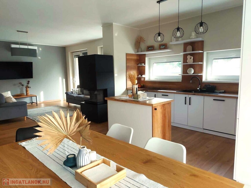 Nyírpazony-Kabaláson eladásra kínálok egy 136 m2 nappali+4 szobás, dupla komfortos családi házat. 2022-ben 30-as Porotherm okos téglából épült, 15 cm szigeteléssel. Elosztását tekintve 4 külön nyíló szoba, étkező, amerikai konyha-nappali, 2 fürdőszoba, spájz, gardrób. Nappaliból 20 m2 teraszkapcsolattal. Értékét tovább emeli a beépített kandalló, klíma. Egyedi tervezésű gépesített konyhabútor minőségi gépekkel felszerelve. Fűtéséről gázkazán gondoskodik padlófűtéssel. Riasztóval szerelt, kamera rendszerrel ellátott. A telek területe 1403 m2, mely részben térkövezett. 2 állásos garázs, elektromos kapuk, fűthető medence. Bővebb információkert várom hívását. Az ingatlan azonosítója: 97701Érdeklődni: +36303275386 Az ingatlan azonosítója: 97701 Érdeklődni: +36303275386