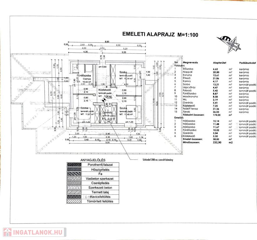 Emelet: 3 szoba, gardrób, fürdőszoba + WC