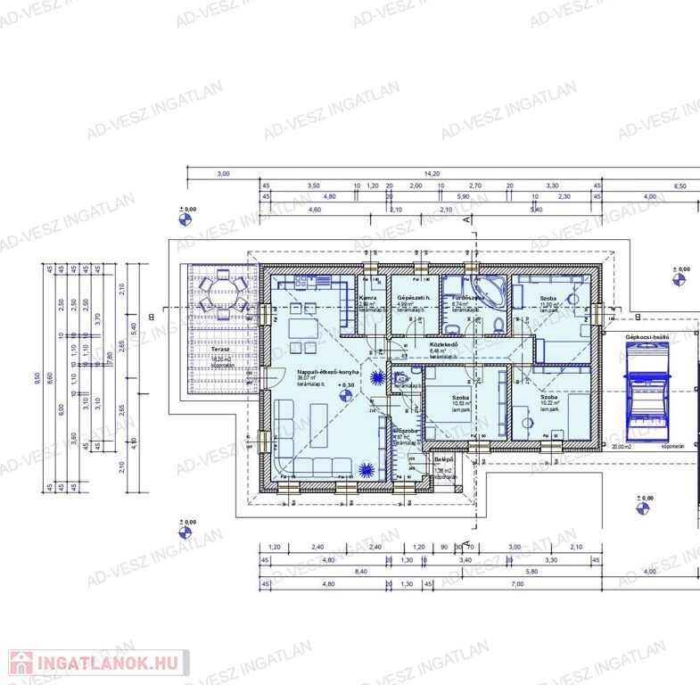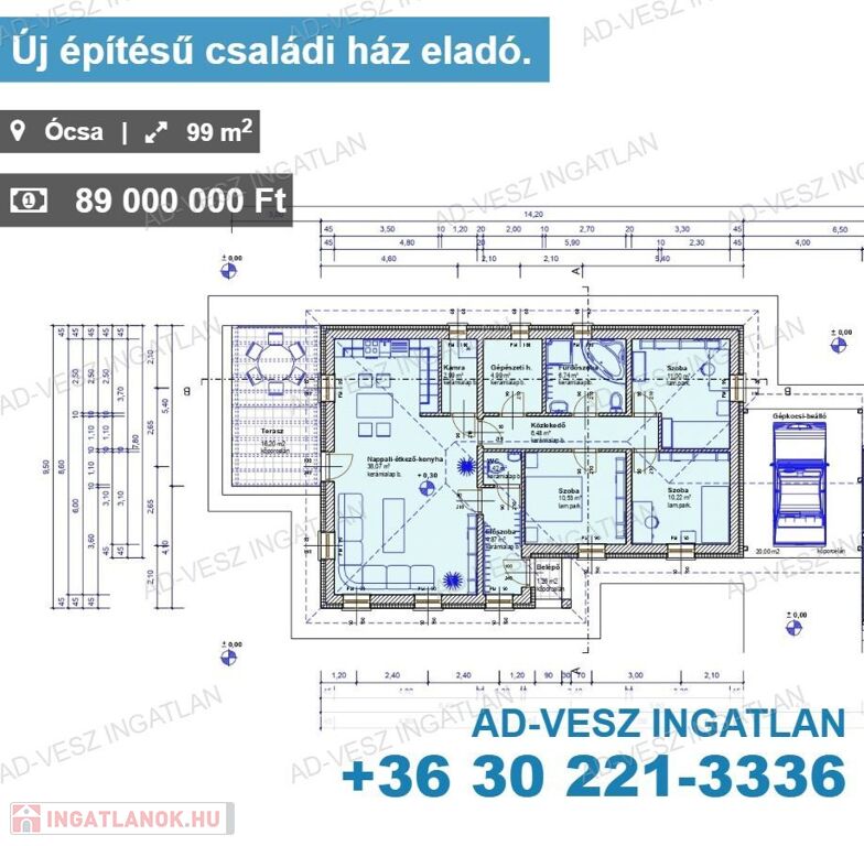 A mintegy 732m2-es teljesen sík telken egy minden igényt kielégítő, modern, 98m2-es családi ház épül.