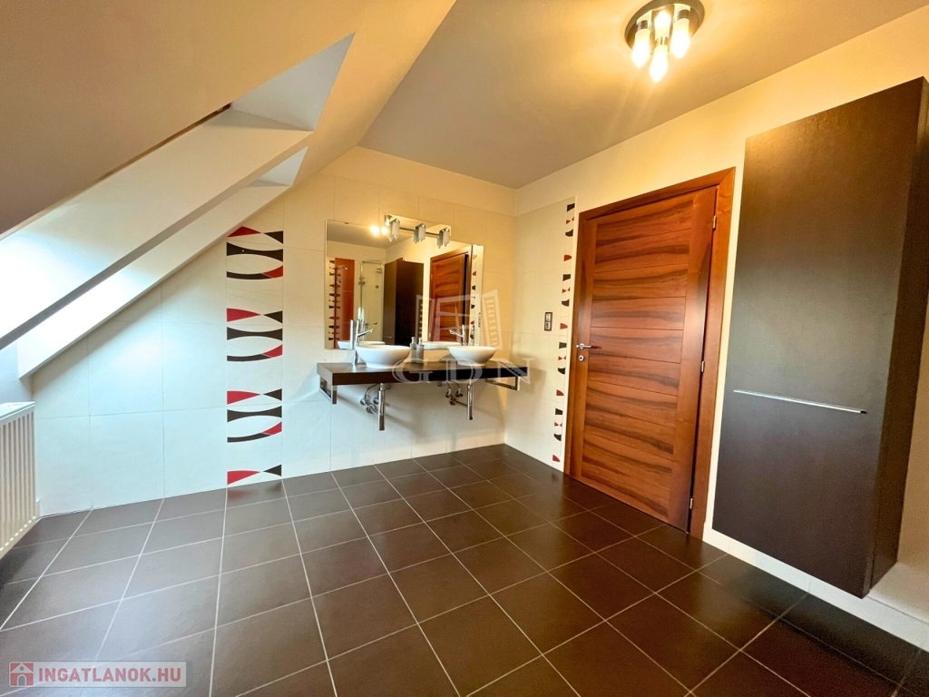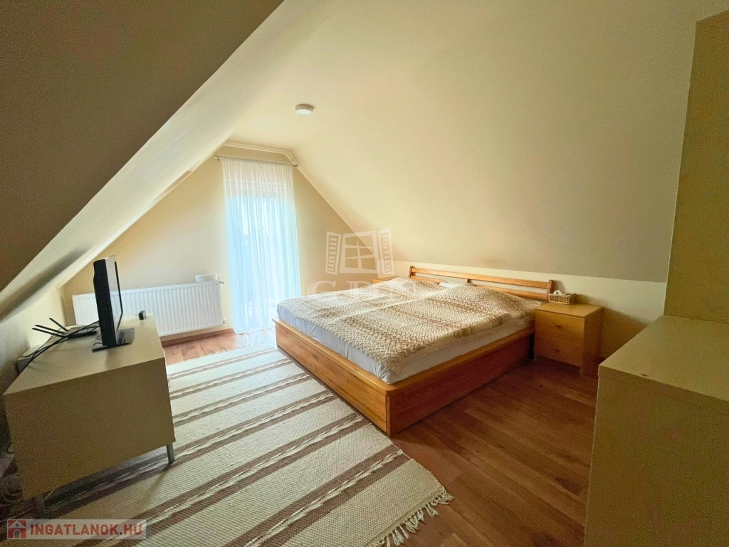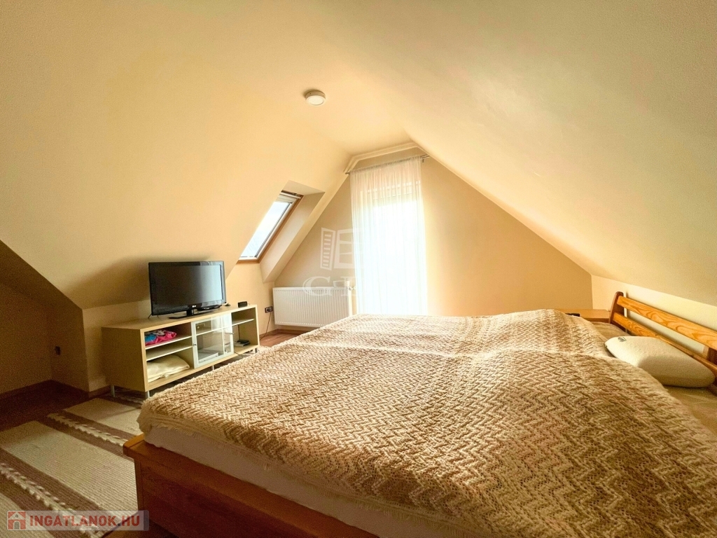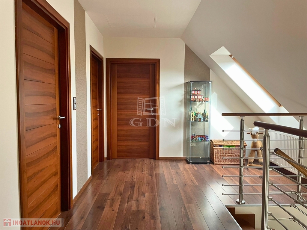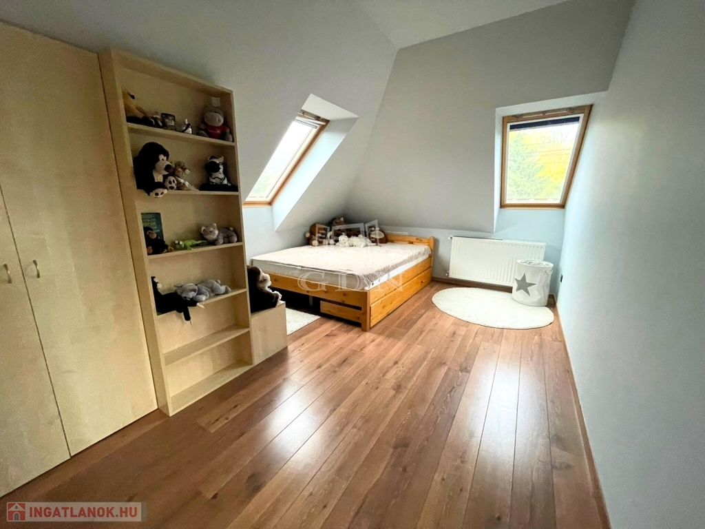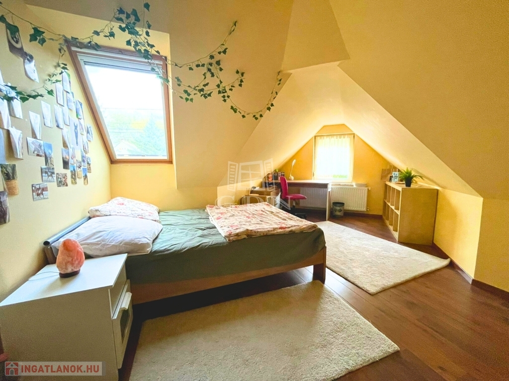 A nappali impozáns eleme sötétszínű, kényelmes lépcső, amely a tetőtérbe vezet. Itt 3 hálószoba és egy zuhanyzó+WC kapott helyet, kis előtérrel. A szobák hangulata a tető összetett kialakítása miatt igazi elvonulós, pihenős, privát helyek a család kisebb-nagyobb tagjai számára.