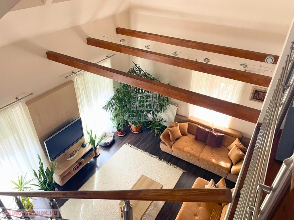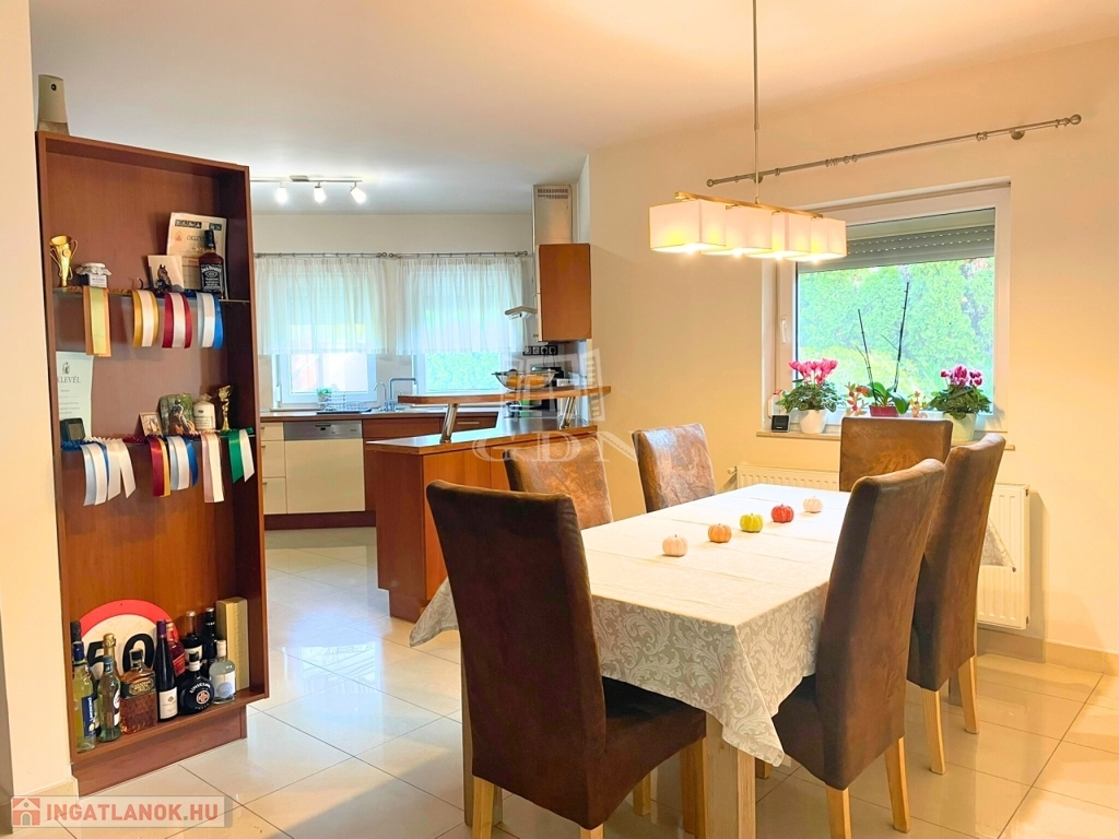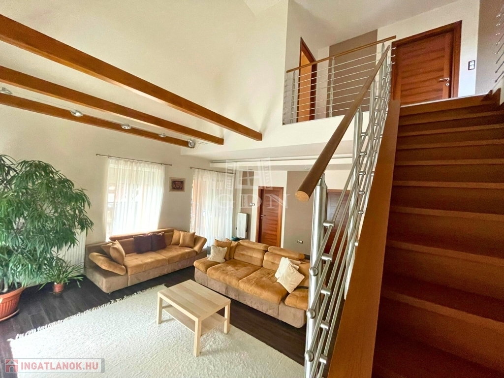 A házba belépve a közlekedőn át egy ízlésesen kialakított és meleg hangulatú térbe érkezünk, ahol 2 lépcsőfokos szinteltolással elkülönül a nagy étkező-konyha rész és a galériás kialakítás miatt, tágas és világos terekkel rendelkező, otthonos nappali.
