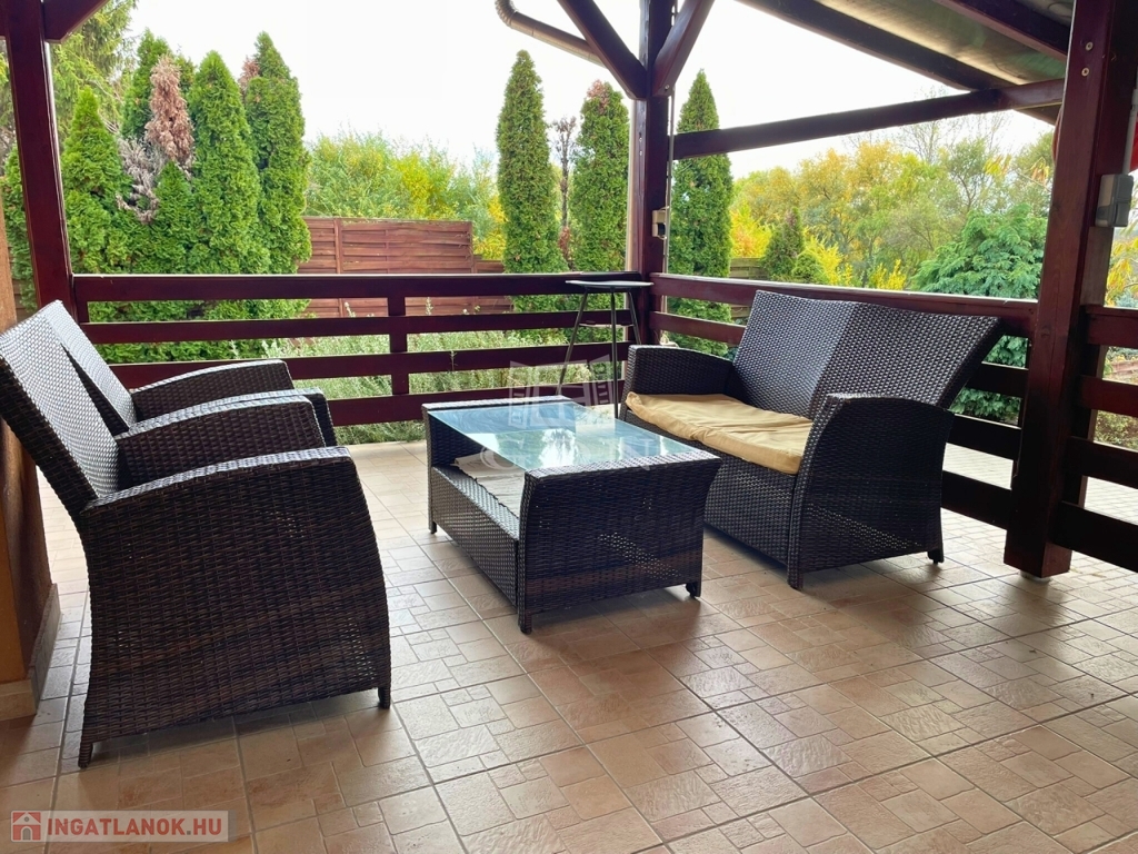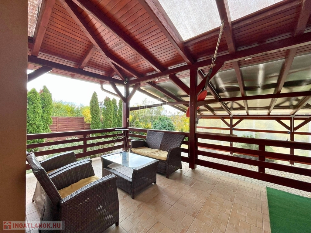 Télen-nyáron élvezhetjük a nappaliból és az udvarról is megközelíthető nagy, fedett teraszt, ami jó beszélgetések, pihenések ideális helyszíne.