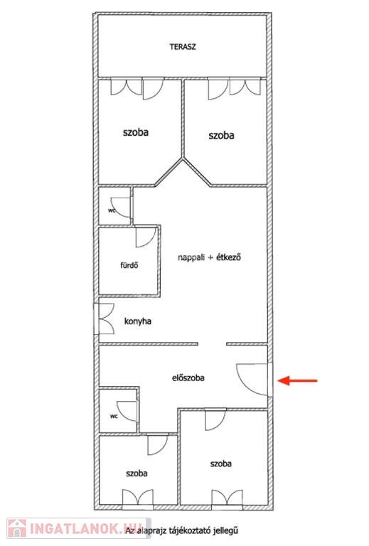Felosztása: 4 hálószoba, 1 amerikai konyhás nappali, 2 mellékhelyiség, egy fürdőszoba, terasz.