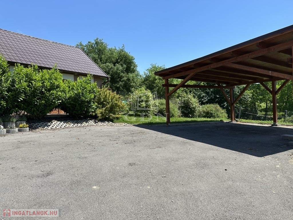 Az udvar egy része térkővel borított, két gépkocsi tárolására a fedett beállóban adott a lehetőség. A telken egy téglával kirakott, jó állapotú pince is teret kapott.