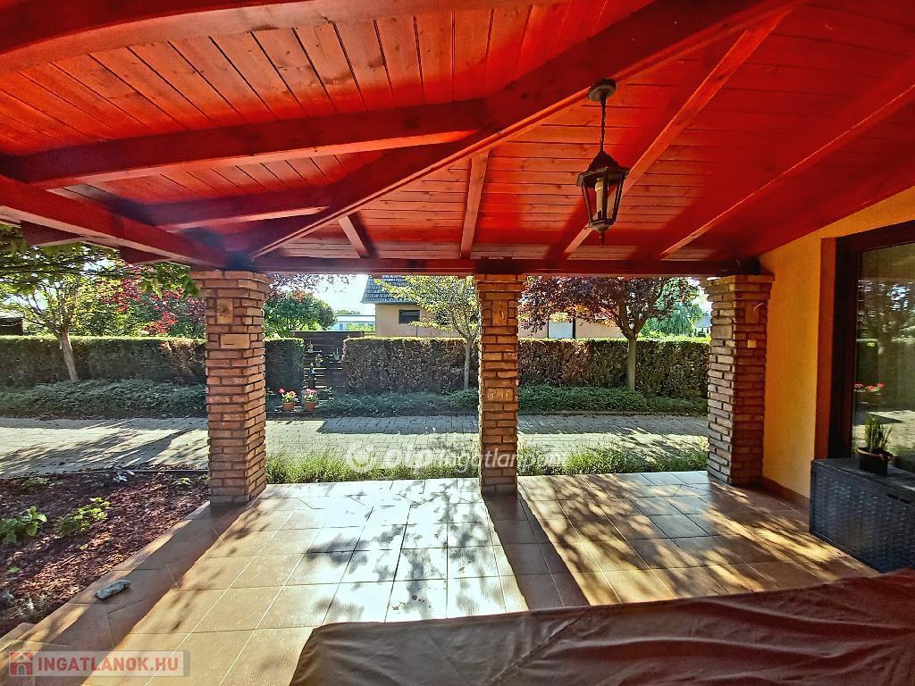 Az épületből az udvar felé egy hatalmas fedett teraszra lépünk ki, ami nemcsak összeköti a házat a kétállásos garázzsal, hanem a családi összejöveteleknek is bőséges helyet biztosít.