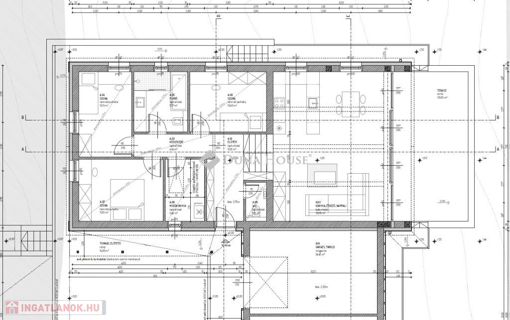 - 1 szintes lakótér: 3 szoba, 1 fürdő, 1 külön WC, valamint tágas, teraszra nyíló nappali, konyha és garázs.