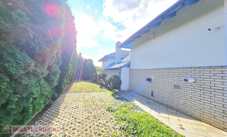 A házhoz tartozik egy **1000 m²-es parkosított telek**, garázsokkal, tárolókkal és udvari beállókkal.