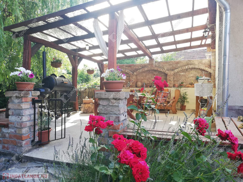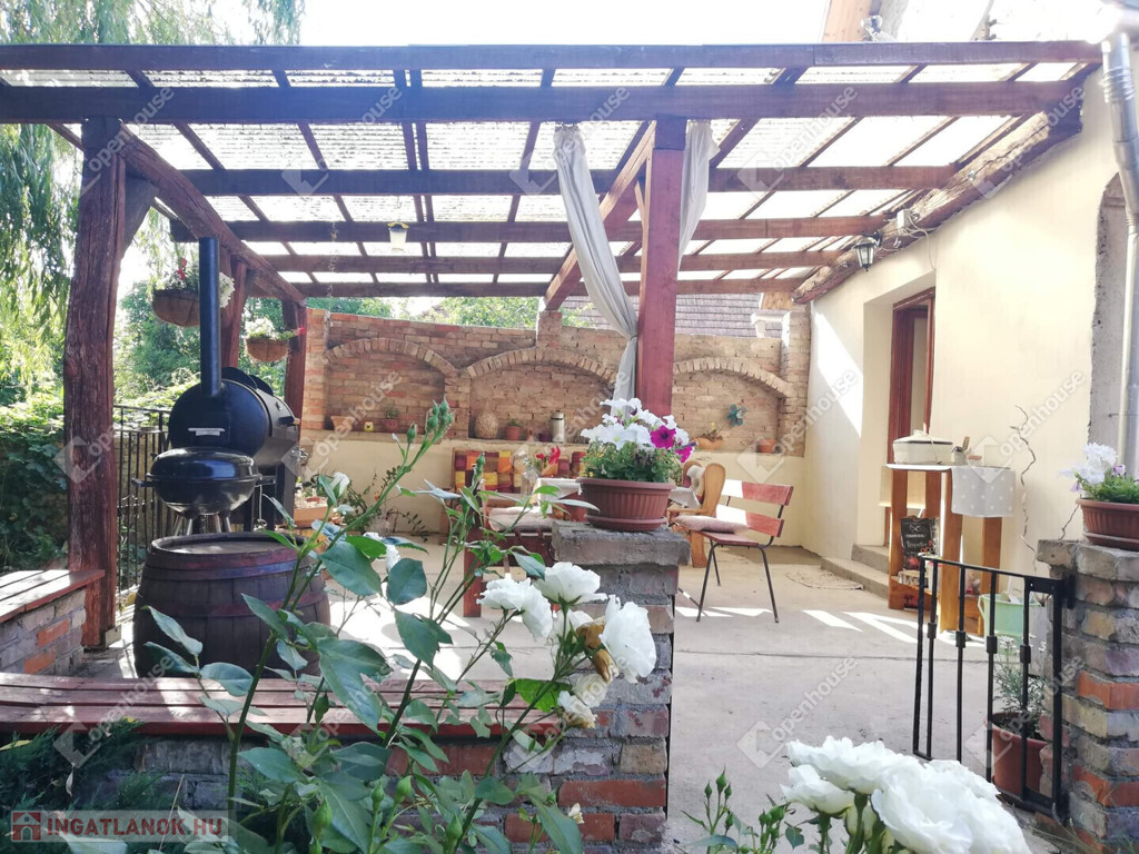 A nappaliból nyílik egy gyönyörű fedett terasz, amely régi, címeres téglából készült, autentikus rusztikus hangulatot teremtve. Ez a stílus természetes, történelmi karaktert kölcsönöz a kertnek, amely tökéletesen illeszkedik a vidéki környezethez.