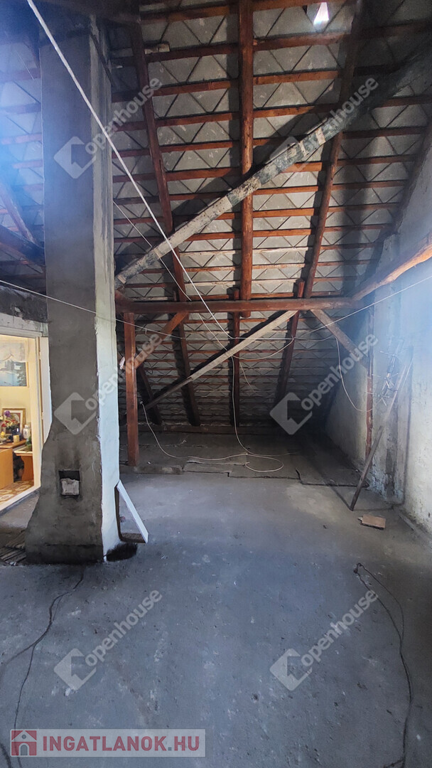 A kert végében egy nagy méretű, magas belmagasságú csarnok található, traktorbejárattal – kiváló lehetőség vállalkozásra, tárolásra vagy akár műhelynek!