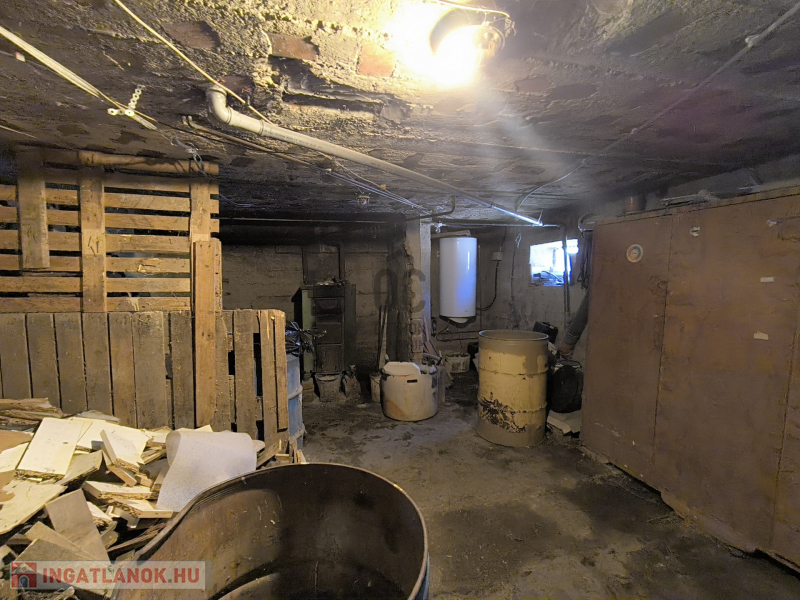 A ház részben alápincézett (a két első szoba kivételével), tüzifa illetve termény tárolására is alkalmas, de itt található a központi fűtésért felelős vegyestüzelésű kazán - gázvezeték az utcán található, nincs bevezetve -, valamint a melegvíz ellátásért felelős villanybojler is.