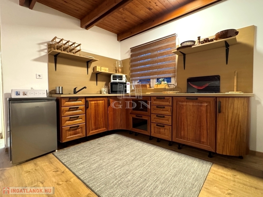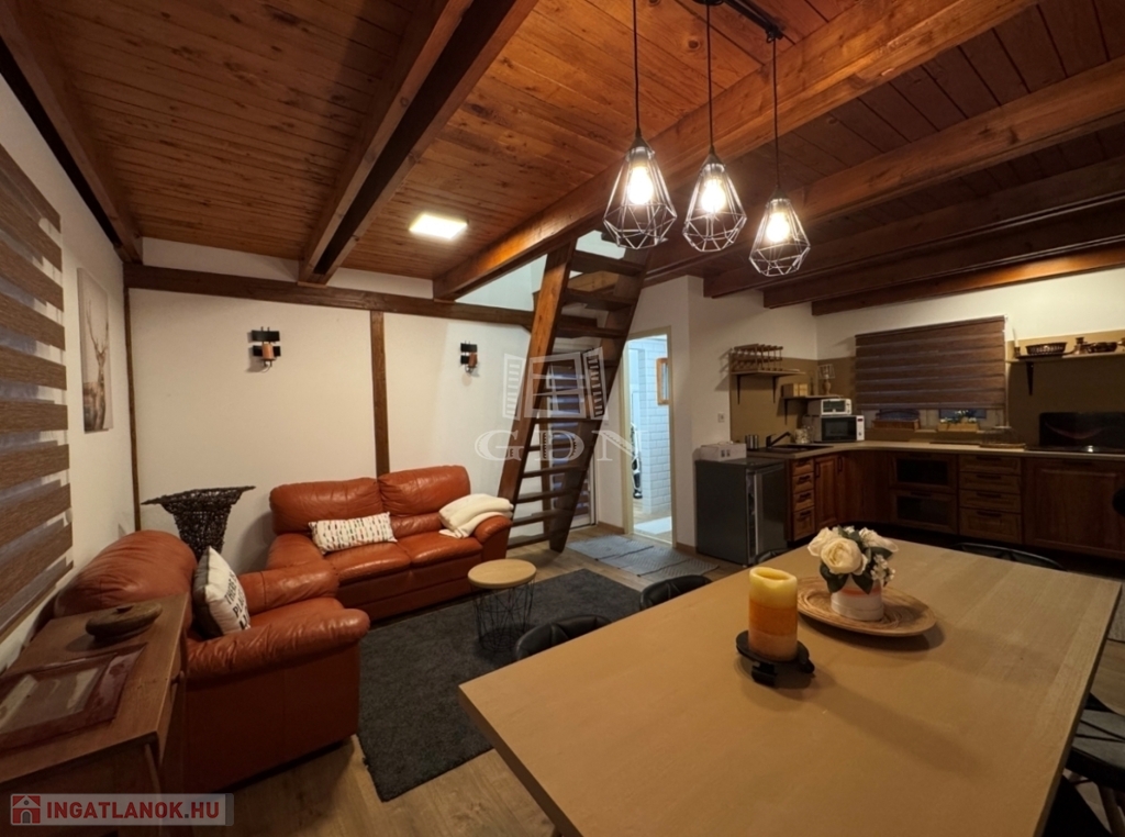 A földszinten amerikai konyha, fürdőszoba és WC található. A tetőtér beépített, két szoba került kialakításra.
