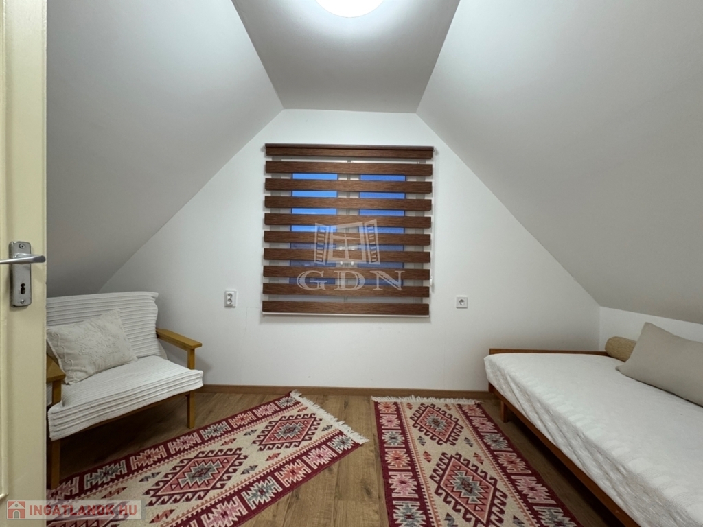 A földszinten amerikai konyha, fürdőszoba és WC található. A tetőtér beépített, két szoba került kialakításra.