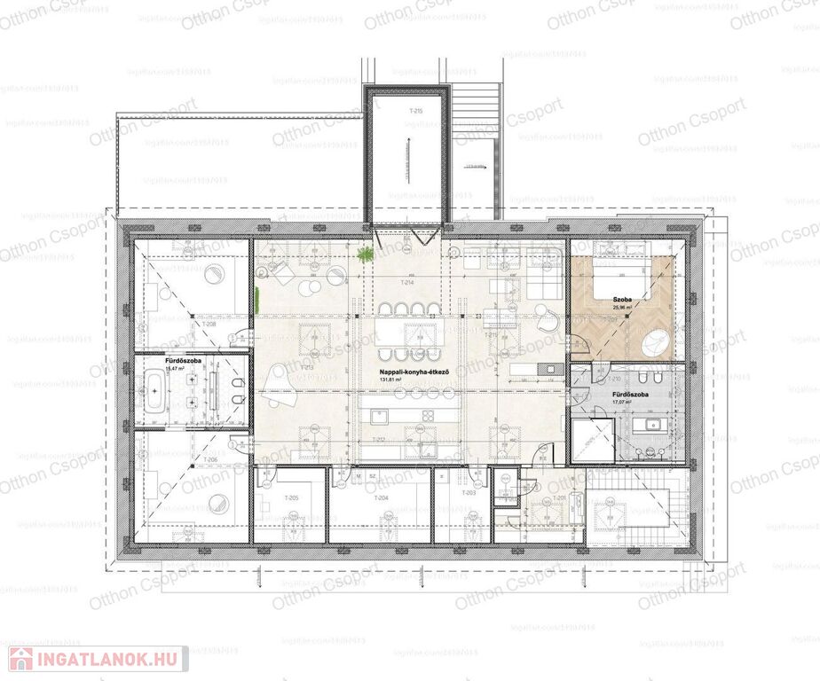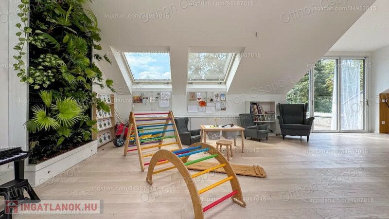 - Egy légterű, amerikai konyhás nappali, gyerek- és, szülőisarokkal (130 m²).
