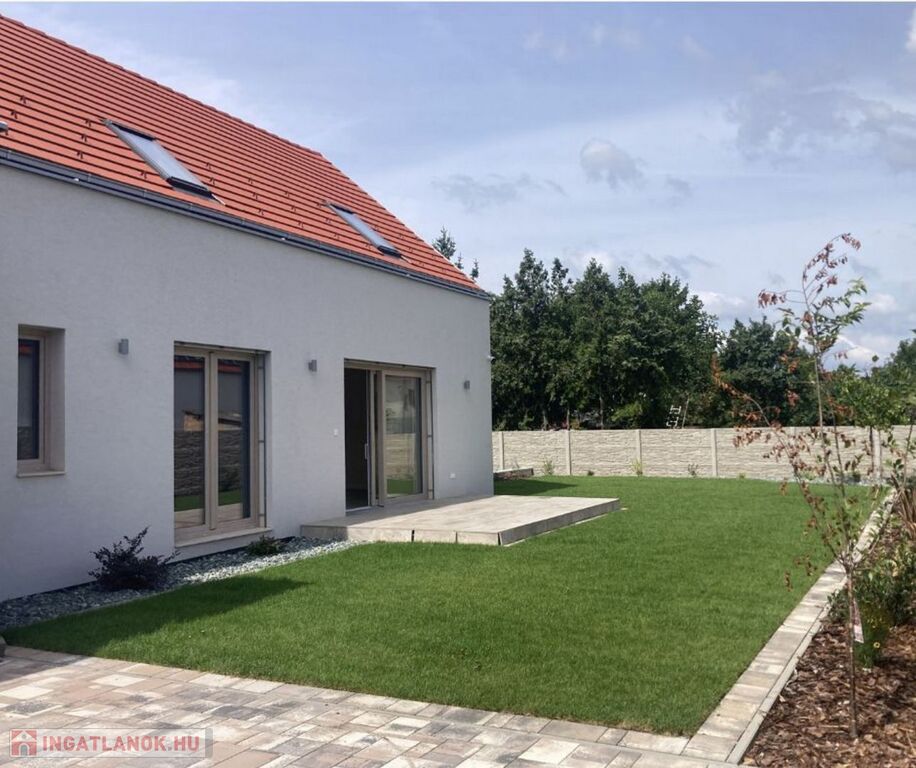 Pannonhalma, központi, csendes utcájában, 470 m2-es telekrészen elhelyezkedő, új építésű 162 m2-es, nappali plusz 3 szoba elrendezésű lakóház 13 m2-es terasszal, 23 m2-es garázzsal eladó.