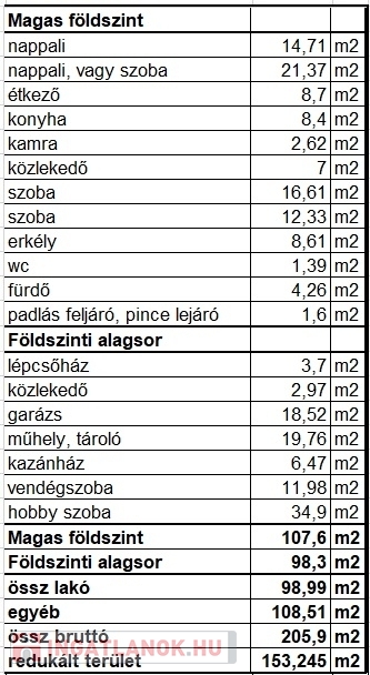 Belső elrendezés (az alagsori földszint és a magasföldszinti lakószint alaprajza és helyiséglistája a fotók között megtalálható)