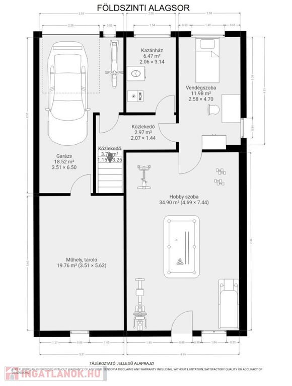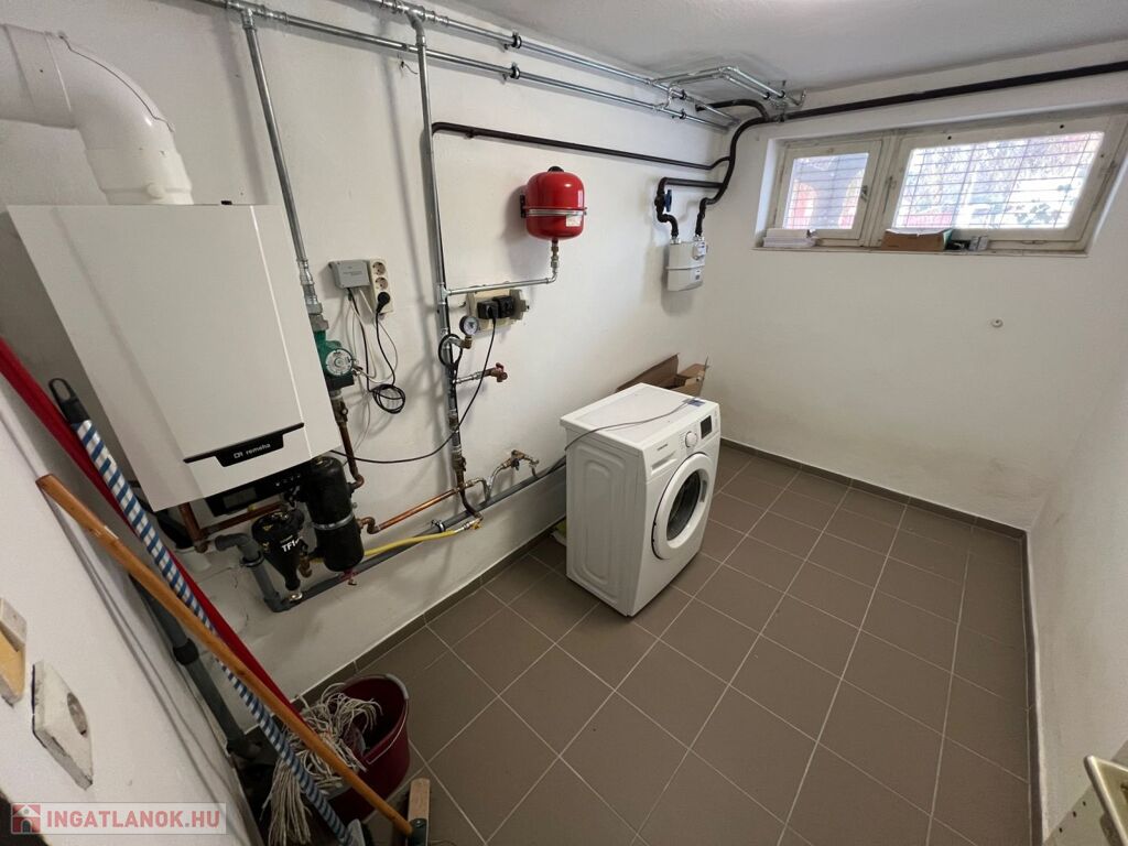 Itt helyezkedik el a garázs, a kazánház és mosókonyha, egy vendégszoba, valamint tároló helyiségek, amikben akár konditermet, műhelyt, hobbiszobát lehet kialakítani, vagy vakár üzleti tevékenység folytatására is alkalmas.