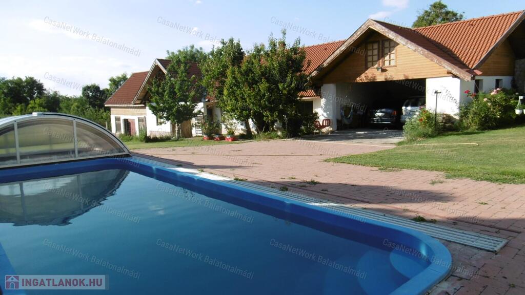 - a gondozott portát két részre osztották: a családi ház melletti füvesített területen helyezkedik el a nagyméretű fedett medence, a kerti kiülő, a virágoskert ... minden, ami egy kényelmes otthonhoz kell; a távolabbi gondozott udvar közel 180 gyümölcsfával büszkélkedik; ha még távolabb tekintünk, zavartalanul elláthatunk egészen a Bakony lábáig