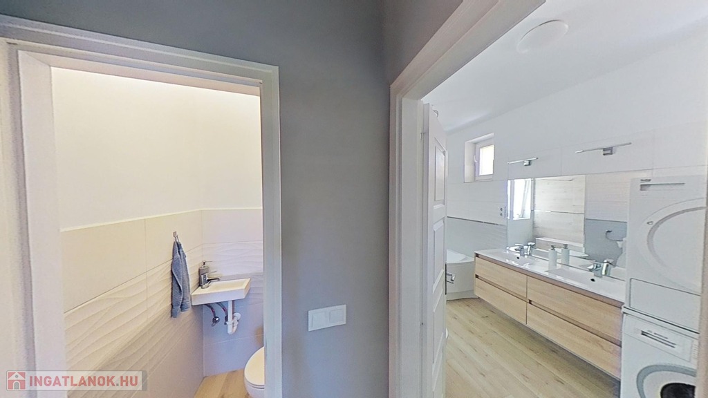 A nagyméretű fürdőben helyett kapott egy gyönyörű, erdei kilátással rendelkező zuhanyzó, egy sarokkád, wc, valamint egy dupla mosdó is. Természetesen egy külön wc is rendelkezésre áll még. A házban az összes szaniter minőségi, Hansgrohe termék.