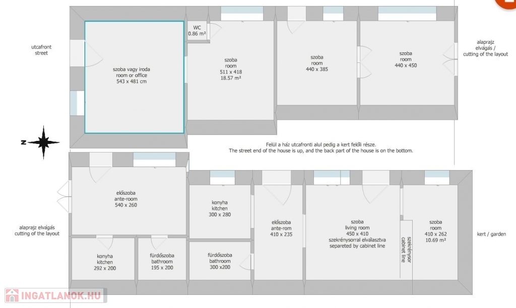 Az ingatlan bejárata a város főutcájára néz, ezért üzleti-irodai célra is kiváló. A 6 szobás, 3 fürdőszobás, 2 konyhás ház azonban 3 különálló bejárattal is rendelkezik, és a telken befelé haladva csendes lakóotthon kényelmét nyújtja. Falai 70 cm vastagságúak, a ház alatt pedig hatalmas kőpincével rendelkezik, ami kb. 35 nm méretű.