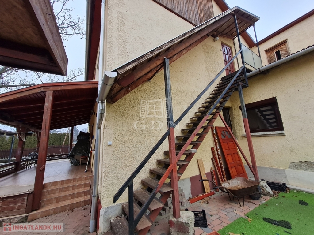 A két lakrészhez, 632 m² telek tartozik. Az udvaron, kétállásos GARÁZS és TÁROLÓ, és a ház egy része alatt PINCE van.