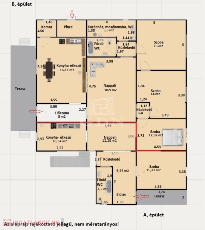 A földszinten lévő lakószint, nappali + 3 hálószoba, nettó 111,12 m². Az emeleti külső lépcsős, külön bejárattal és külön KÖZMŰÓRÁKKAL rendelkező lakás, nappali +3 félszoba, nettó 71,98 m².