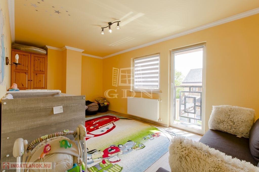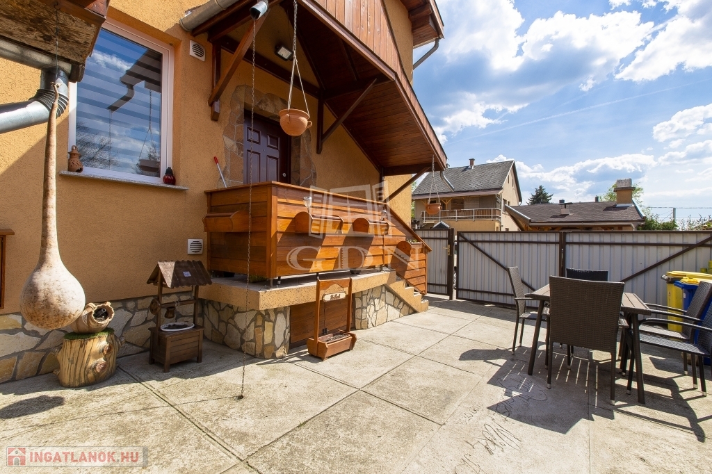 Az újabb épület 2 szintes, 2007-ben épült, beton alapra, 30 cm ytong téglából, körbe 5 cm-es dryvit szigeteléssel, beton födémmel. Ezen az épületen viszont 2022-ben tetőcsere történt, bitumenes födém helyett, Lindab cseréplemezes fedést kapott, illetve műanyag thermo nyílászáróval rendelkezik. Ez az ingatlan kiváló állapotú, folyamatosan karbantartott, dupla fürdőszobával, épített kandallóval, riasztóval felszerelt, melyhez tartozik egy közvetlen fedett gépkocsibeálló és egy medence is.