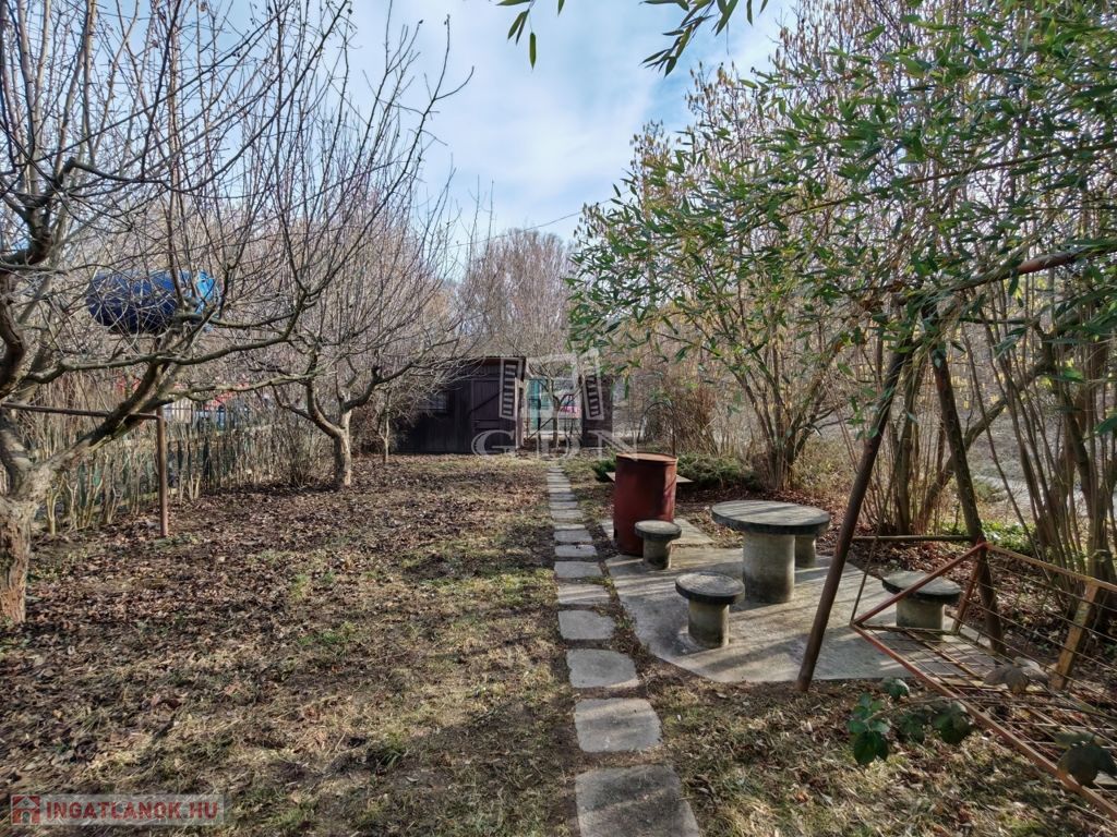 A telek végében, fa szerkezetű szerszámtároló és kültéri WC húzódik.