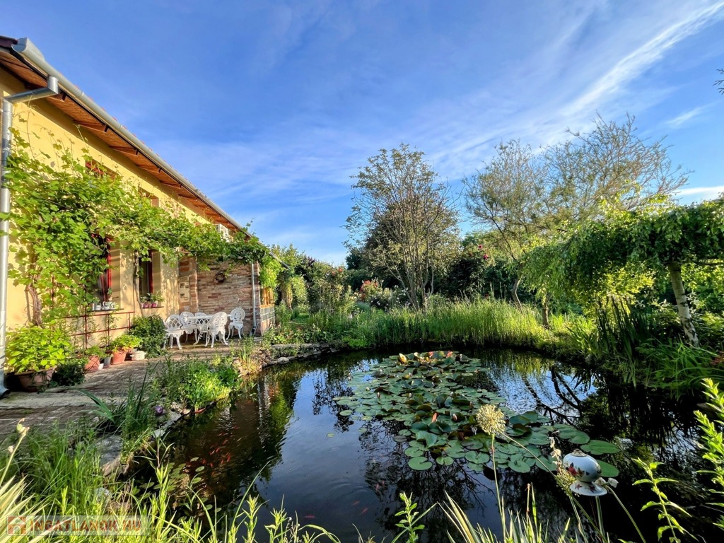 A környezetet egy rózsával körbefuttatott lugas, padok, pihenőhelyek teszik mesebelivé. Közvetlenül a ház mellett került kialakításra egy kerti tó díszhalakkal és tavi növényekkel, fedett és nyitott terasz, konyhakert, valamint a ház mögött kapott helyett egy fedett tároló és tűzifatároló.