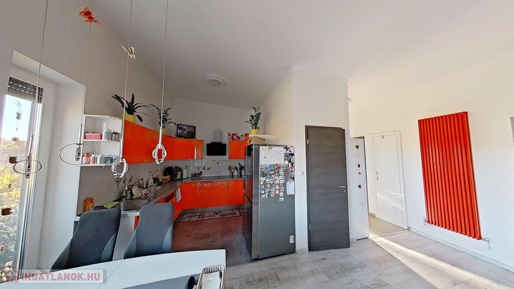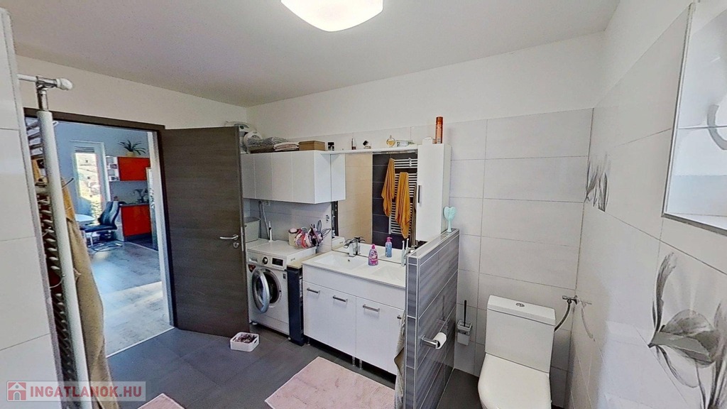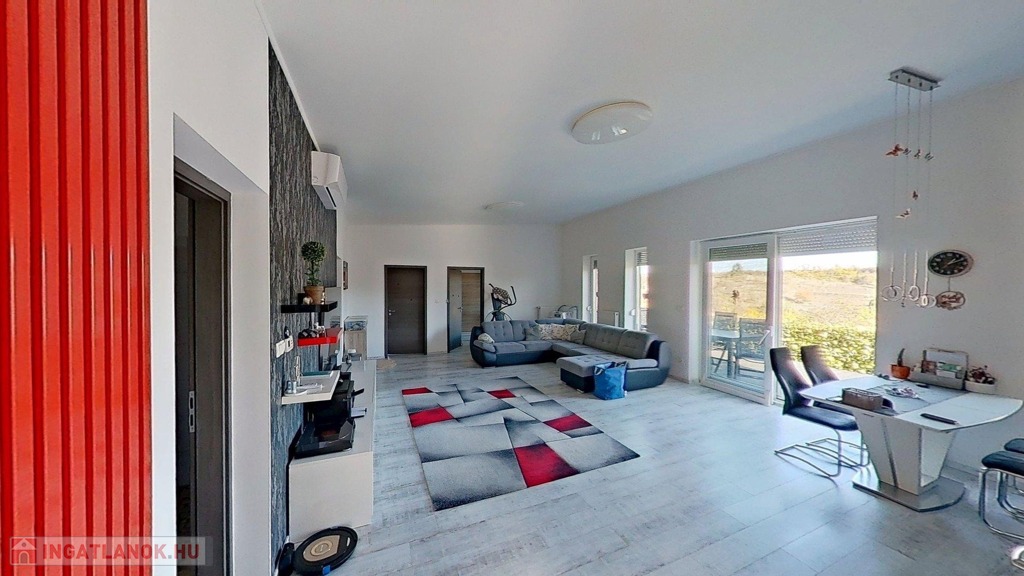 A ház elosztása nem is lehetne jobb, az egy szinten minden a hatalmas nappaliból nyílik. Innen nyílik 3 hálószoba - a szülői háló ráadásul nagy gardrób szobával is rendelkezik - fürdő, valamint innen lehet kimenni a páratlan panorámával bíró, 20 nm-es teraszra is.