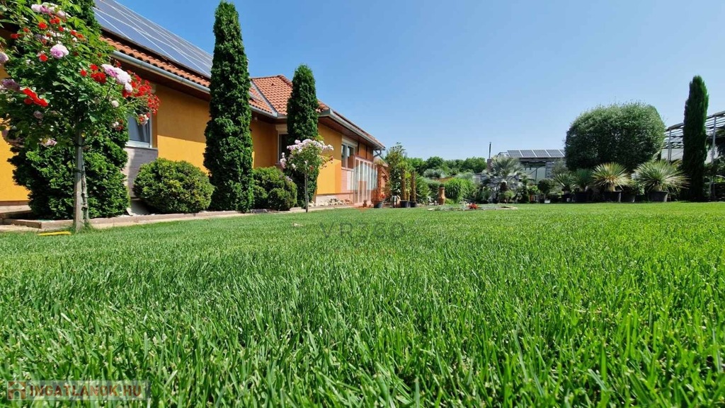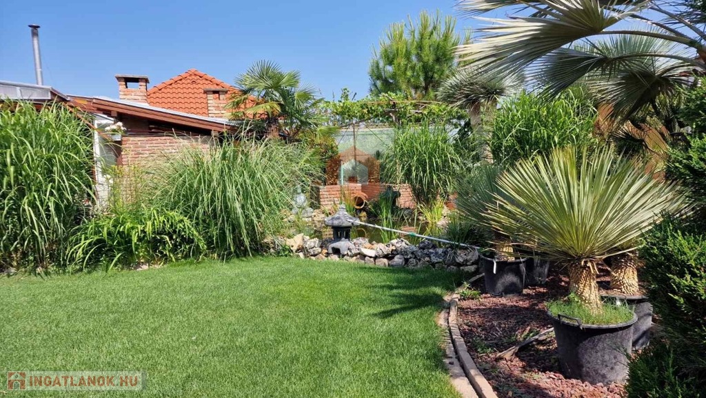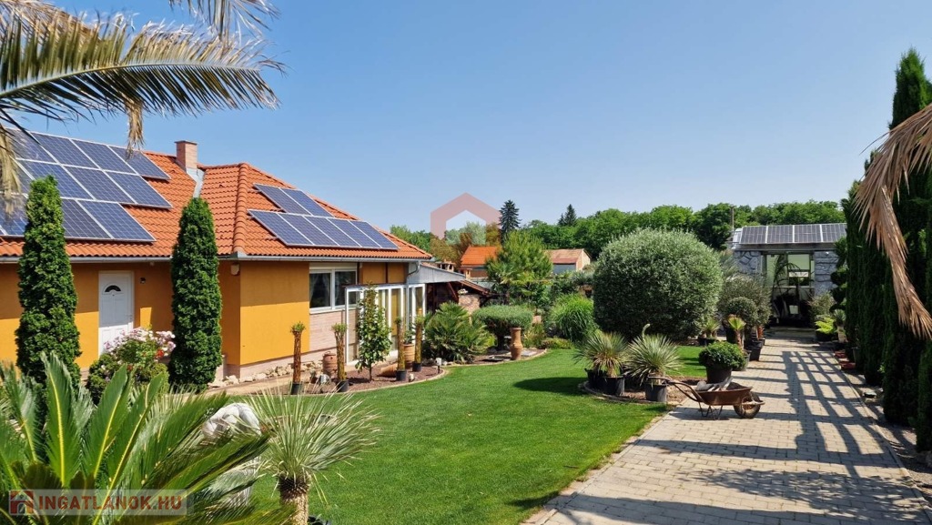 és benne egy 100 m²-es üvegház extra belmagassággal, kétfajta fűtéssel, japán pagodával.