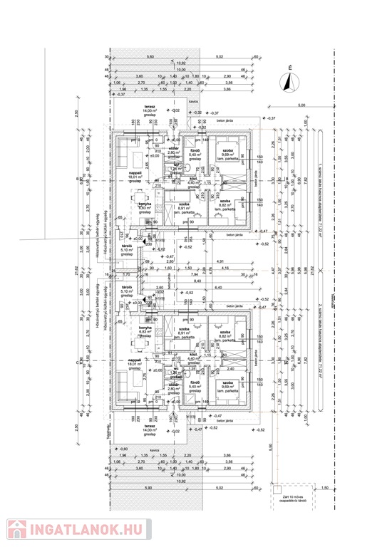 14 m2-es teraszos, 1 szintes iker családi ház lakásai eladók. A lakásokhoz kocsibeálló és egy kis kertrész is tartozik.