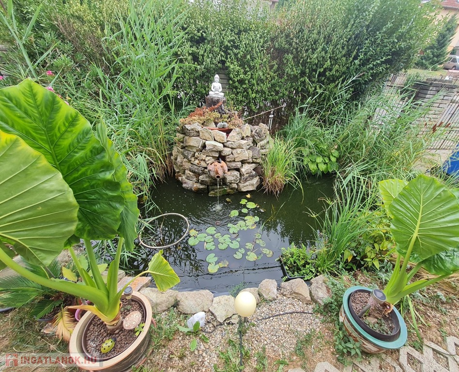 A 1304 m²-es telek keleti tájolású, gondozott, lejtős kialakítású. Az udvarban fúrt kút biztosítja az öntözést, emellett kisméretű medence és melléképület is található, amelyben barkácsműhely és pince kapott helyet. A hátsó, lépcsősen kialakított, bekerített telekrész ideális veteményesnek vagy pihenőkertnek.