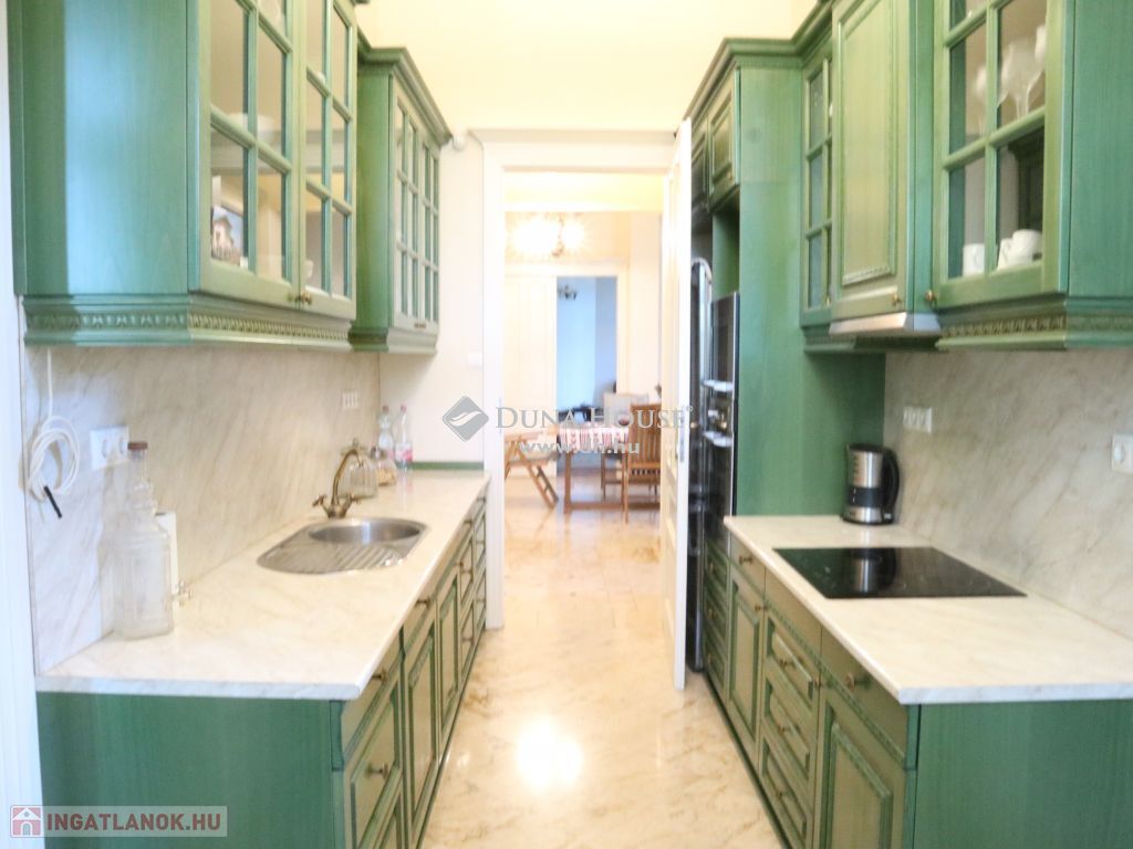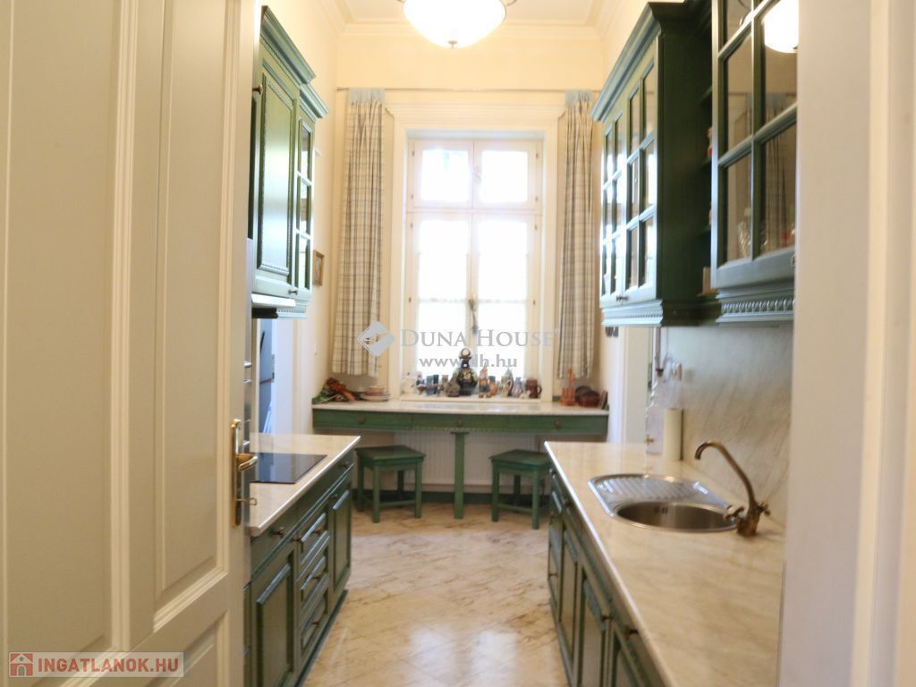 A földszint tágas terekből áll össze, mely magas, nagyméretű ablakokkal határolt, belmagassága 3,65m, körbenapozott, így kellemes, világos, szellős miliőt biztosít reggeltől, estig. A nappali ideális méretű, 41m2, ahonnét a biliárd szoba, valamint a keleti terasz közelíthető meg, mely nyáron a délutáni órákban kellemes, hűs időtöltésre ad lehetőséget, kilátással az ősfás parkra. Ezen a szinten, egyebek mellett, helyet kapott még kettő hálószoba, melyekhez saját fürdő tartozik és egy 24 m2-es étkező, amihez a nyugati oldali terasz és asztalos által, egyedileg, keményfából gyártott konyhabútorral felszerelt, gépesített konyha kapcsolódik. Ennek az épületnek egyebek mellett, egyik ékessége a Zsolnay gyár által egyedileg tervezett és készített, kézzel festett majolika cserépkályha, ami biliárd helységben található.