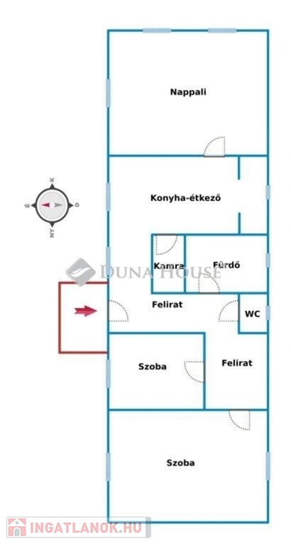 Helyiségek: 2 hálószoba ( 3 szobává alakítható), 36 m²-es nappali, konyha-étkező, kamra, fürdő, WC