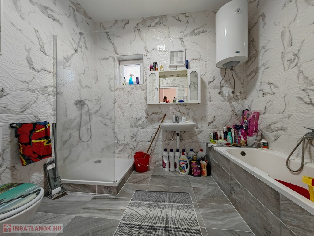 Az ingatlan elosztása átgondolt és praktikus: a tágas, napfényes amerikai konyhás nappaliból csillagszerűen nyílnak a hálószobák és a vizesblokkok, így biztosítva a család minden tagjának a magánszférát. A fürdőszoba igazi komfortzóna, ahol a modern kád mellett egy külön zuhanyzó is helyet kapott. A reggeli készülődés kényelmét a fürdőtől különálló, plusz mellékhelyiség teszi teljessé.