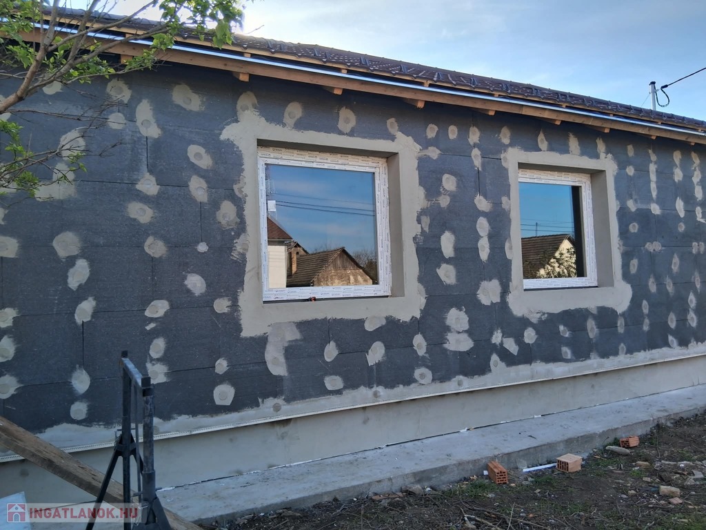 A ház alapterülete 120 m2, a telek 2300 m2.A telken bőven van hely plusz melléképület, garázs, kerti tároló, stb. kialakításához. Elosztása: 3 szoba, plusz egy nagy légterű amerikai konyha-nappali, egy nagyobb, családi fürdőszoba (kád+zuhany), és a szülői háló mellett egy kisebb fürdőszoba (csak zuhanyzó). Valamint egy háztartási helyiség is van az épületben, itt már előkészített kiállások a mosó-és szárítógép számára. A ház 30as Porotherm téglából épült, erre 15 cm vastag grafitos hőszigetelés került, a födémbe 30 cm padlás szigetelés került.A fűtést, melegvizet és a hűtést korszerű hőszivattyú biztosítja, melyhez gazdaságos H tarifa is rendelekzésre áll. A tetőszerkezet kialakítása lehető teszi a későbbiekben napelem rendszer telepítését, de ez már a leendő tulajodnosra vár.