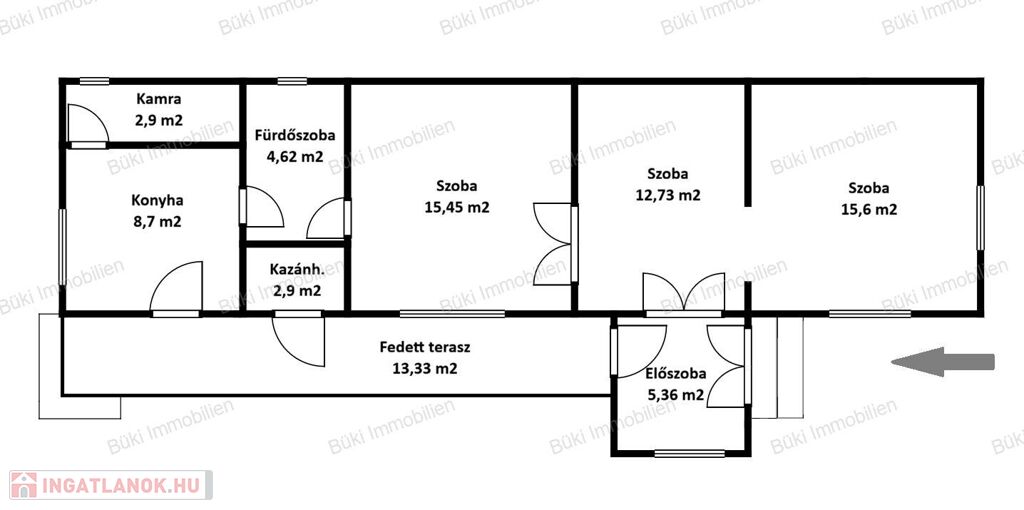 A két irányból megközelíthető előtérből belépve három kedves, jól használható szoba fogadja az embert, a terek világosak, a tájolásnak köszönhetően szinte egész nap természetes fény járja át az otthont. A fürdőszoba két irányból is megközelíthető, ami a mindennapi használat során kifejezetten praktikus megoldás. A konyha barátságos hangulatú ös möretöbül adódóan az étkező is helyet kapott benne. A konyha mellett egy kamra is kialakításra került, így a tárolás is kényelmesen megoldható. Ezen felül külső tároló is rendelkezésre áll.